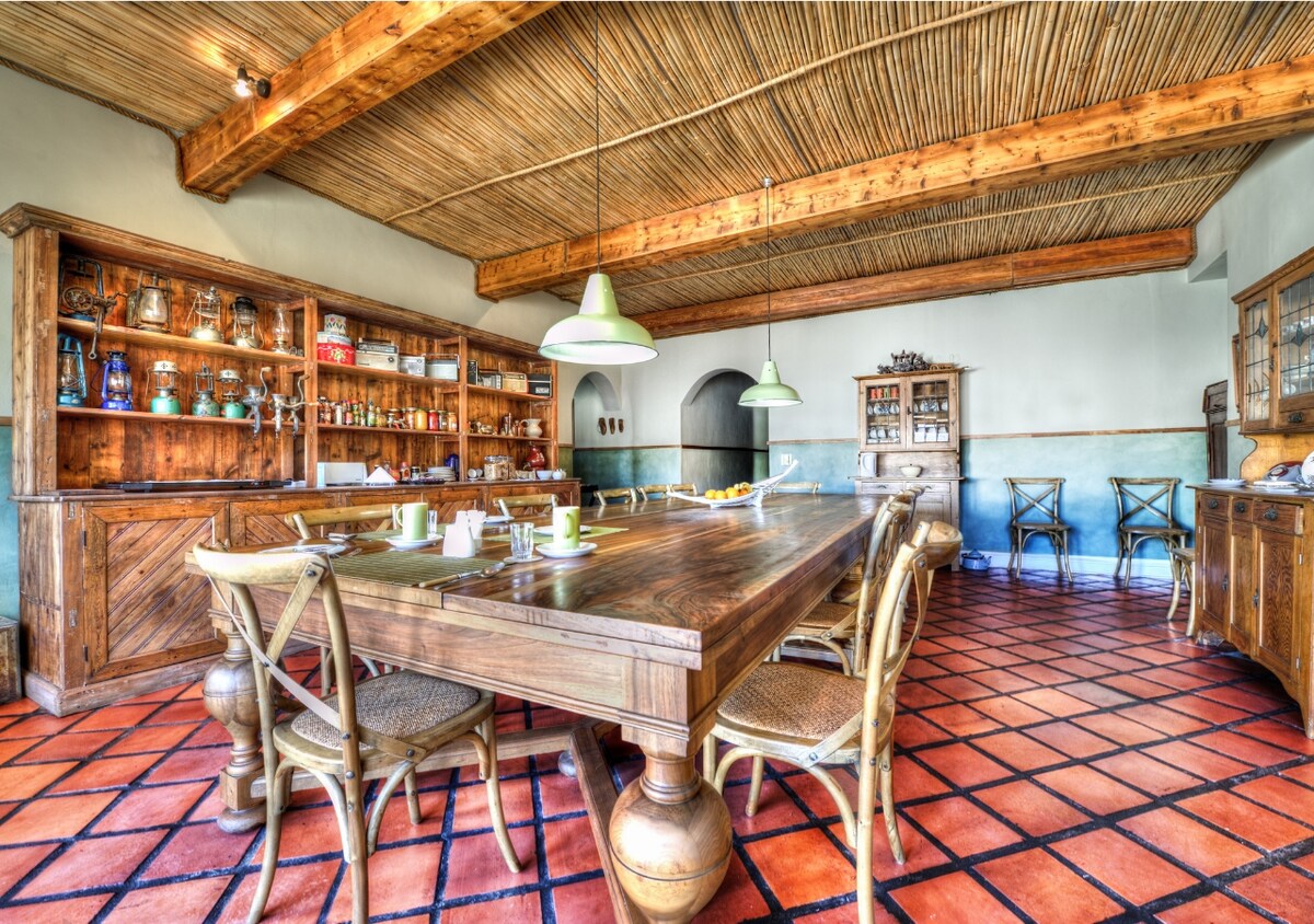 Recently upgraded and renovated farm house built in 1929. Offering 5 en suite private rooms and one with a private bathroom "down the passage". Quiet but only 10 minutes drive to town. Braai facilities and wood available. Shared kitchen with all equipment.