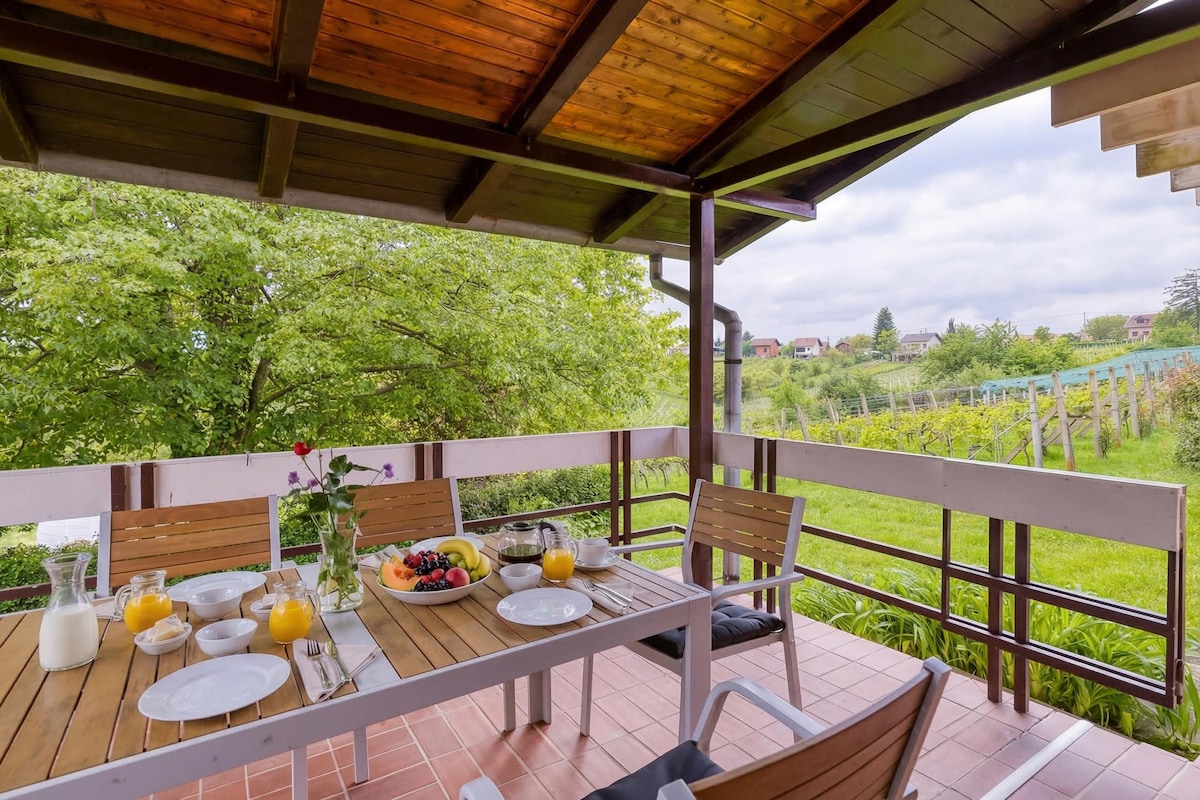 Relax with your family in the pleasant accommodation offered by our Villa Cesarica. A newly renovated holiday home with a pool, beautiful views, opposite the Voštinić-Klasnić winery, offers you a quiet and relaxed environment near Ivanić Grad. The house is surrounded by vineyards, and in our wonderful orchard you have the opportunity to try old varieties of apples, pears, cherries and quinces. If you like to relax, then our pool and deck chairs in the shade are for you, and if you are more into action, we offer you various sports equipment