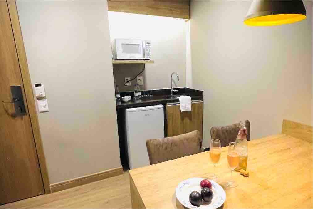 Flat located inside the Sky Borges Hotel, with all the infrastructure: free parking, heated swimming pool, sauna, Jacuzzi, kids space, fitness room, maid service with change of bed linen, bath and room cleaning (MAIDS DO NOT WASH THE DISHES). Air-conditioning, 42" smart TV, cable TV, Wi-Fi and a kitchenette with a minibar, electric oven, electric cooktop, air fryer and microwave. Breakfast is not included but can be consumed and paid for directly at check-out.