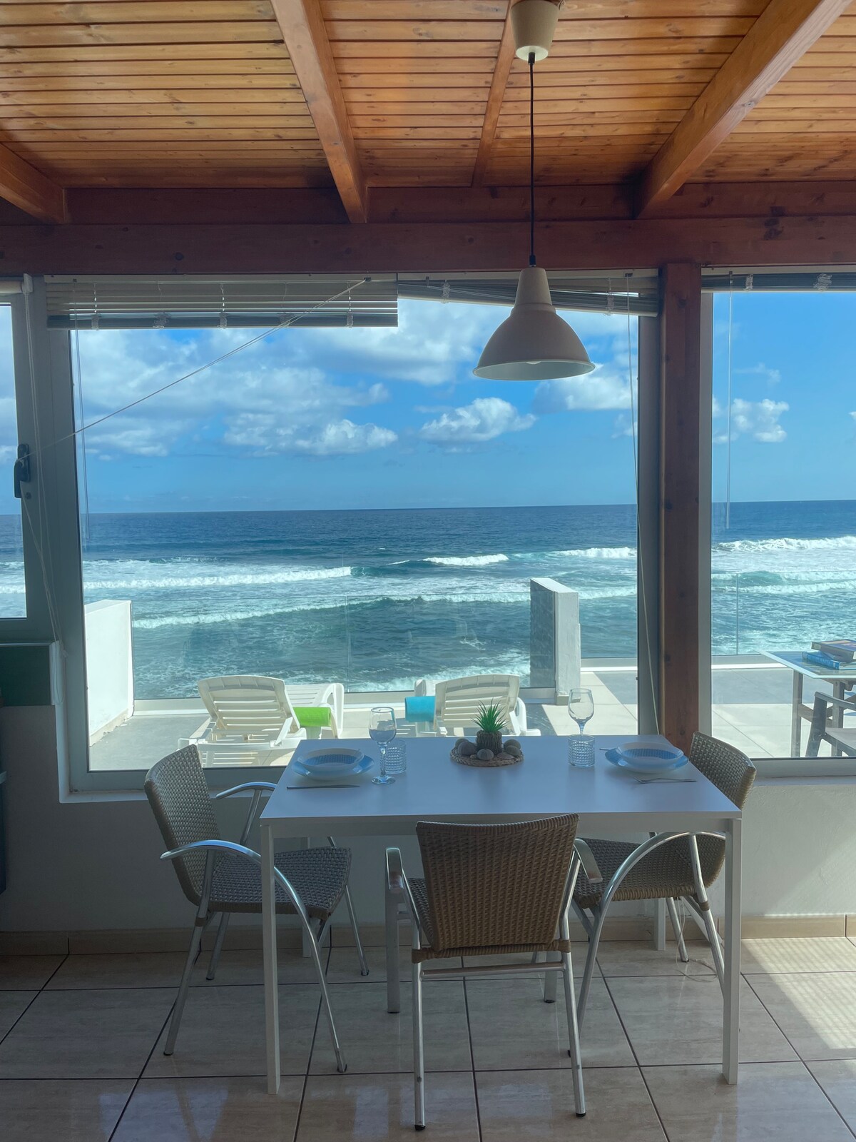 A house that "flies" over the sea. Salinetas beach, Gran Canaria. Architecture and nature come together in this amazing house literally hanging over the sea, in a privileged location on the east coast of Gran Canaria. The building "flies" over the rocks visually plunging into the sea and giving you the feeling of sailing on a boat on the clear waters of the Atlantic. Sleeping rocked by the sound of the waves, or watch, without leaving the bed, the sun reflected in the sea at dawn; dine on the terrace by moonlight feeling the caress of the breeze ... are unforgettable experiences that this house guarantees. The house is very bright and faces the sea. The terrace of the living room has a dining table with room for six people, and the master bedroom terrace has a hammock for sunbathing, relax and enjoy the view or just reading a good book. And how far is the beach? Well, just beside the house! Just open the door and you can go down to the beach or to the rocky surfaces located under the house, with magnificent natural platforms for sunbathing and spectacular “charcones” studded with small marine life. Salinetas is a quiet beach where you can relax, rest, practice water sports, cycling, hiking, all in a very unique and familiar. To the north, a pedestrian maritime promenade connects with the beaches of Melenara , Taliarte , “Playa del Hombre” and “La Garita”. The Promenade features restaurants and terraces where you can taste the cuisine of the area, including the highly recommended "gofio escaldado" or the "papas con mojo”. “Playa del Hombre” is one of the most suitable beaches on the island for surfing. To the south you'll find small coves like “Silva” or “Aguadulce”, or the incredible fishing village of “Tufia”, with its cave houses and its archaeological site, remains of pre-hispanic inhabitants of the island. A little further south, the seaside village of “Ojos de Garza”, the vast bay of “Gando”, and the beaches of “El Cabrón” and “Arinaga”, whose seabed is considered the best in Spain for diving. "Las Clavellinas", the town where the house is integrated has little shops and supermarkets. By car or taking the bus, at a short distance from the house, you can be reached within 5 minutes to the largest shopping and leisure areas of the island, the golf course of “El Cortijo” and the airport itself. The access time to Telde´s historic core is about 10 minutes, 15 to Las Palmas de Gran Canaria, capital of the island, and about 30 to Maspalomas. House Equipment : Ground Floor : Fully equipped kitchen , Patio-Solana , Toilet , Living room, Terrace - Dining room. First Floor: 1 Master Bedroom with terrace and private bathroom. Double bed 1.60 x 2.00 mts. Panoramic View of the sea. It can be arranged upon request a cot - park for children under two years. 1 double bedroom with twin beds, 1 bathroom. Attic: 1 single bedroom + extra bed. General: - Kitchen equipment : fridge-freezer, Induction Stove, Oven , Microwave , Dishwasher , sandwich maker, electric juicer, minipimer with all accessories, food Electric Griddle, Electric Coffee Maker, Toaster, Pantry, Kitchen Utensils and crockery for 6 people. - Solana: Hanger, sink for washing clothes, Washer, Dryer. The Solana has space to store sports equipment (bikes, fishing rods, surfboards, etc.) - Air conditioning in living room and bedrooms. - Entertainment: Internet (WIFI), International TV satellite chanel, TV in master bedroom and living room . - Electric blinds in living room and master bedroom, powered electric awning remote control in living room terrace.