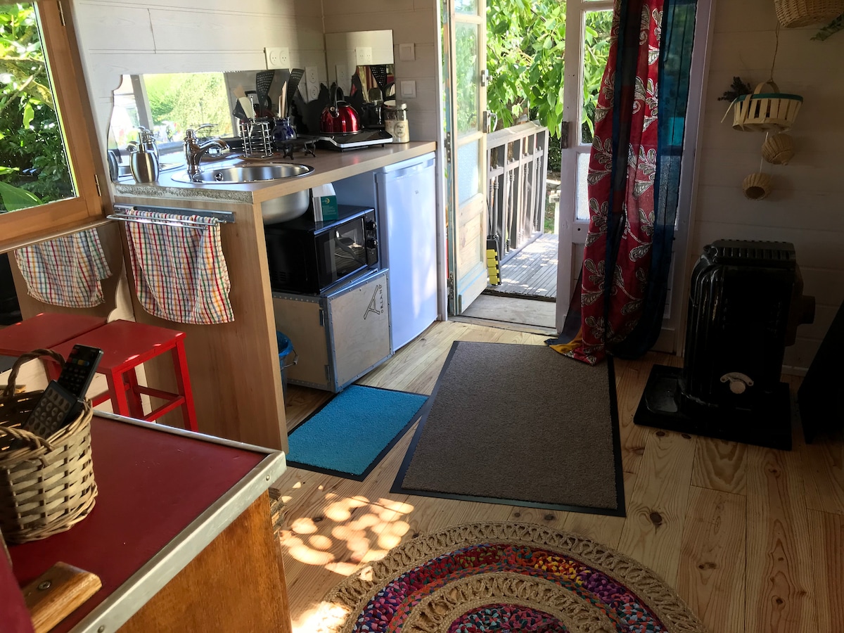 charming trailer in a campsite in the heart of nature. Entirely built by us with wood from our forests. A place of rest par excellence and a starting point for magnificent walking trails. It is equipped with a bed with sheets provided, refrigerator, table and chairs, dishes, coffee maker, garden furniture and barbecue. The bathrooms are outside the accommodation. Breakfast available on site in high season.
