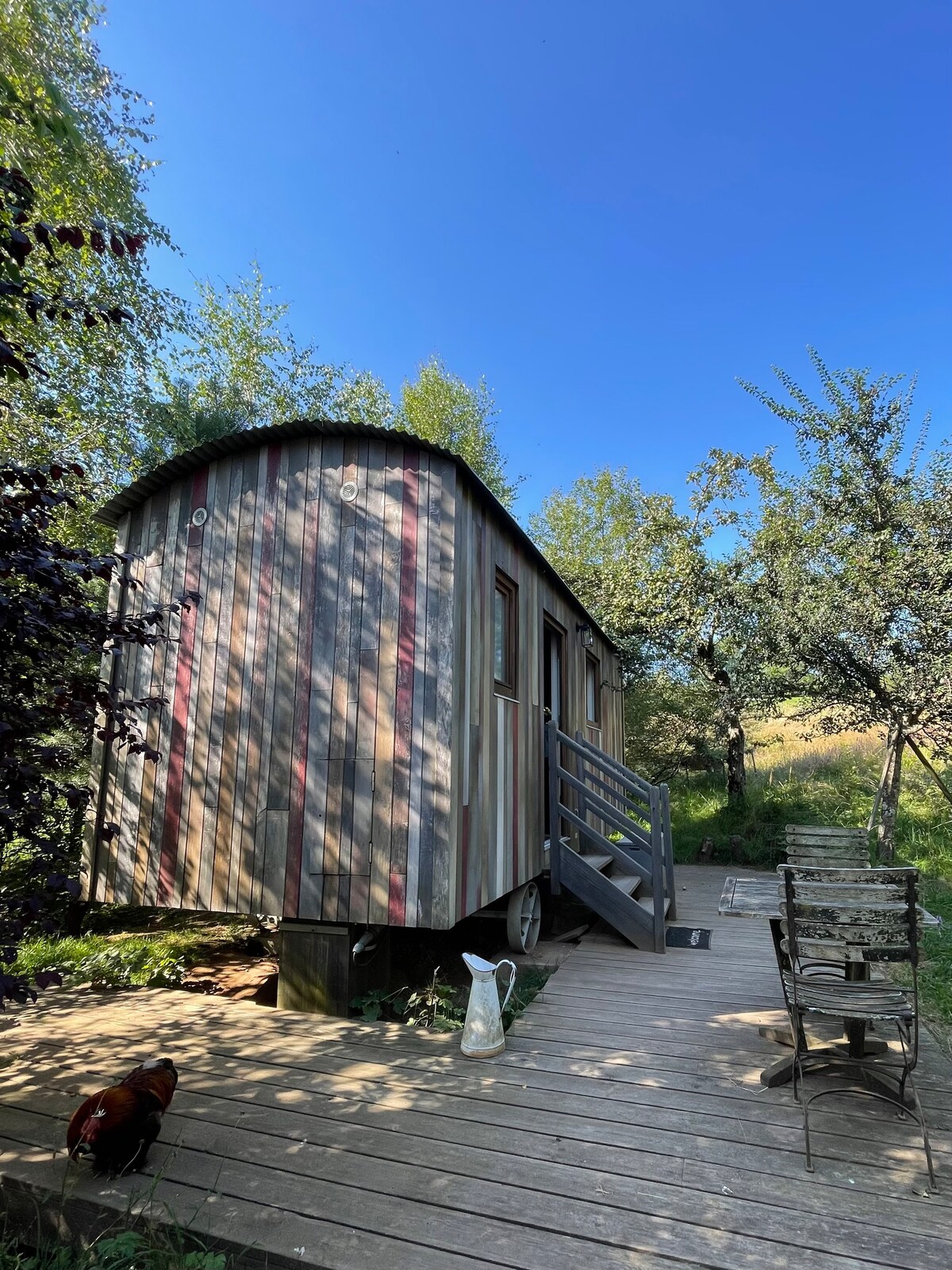New: We have installed a pellet stove for winter evenings in the cottage and the trailer has an electric heater. A new terrace for your meals in the hut. In a quiet little village in the Ardennes, enjoy the sounds of nature when you stay in this unique place. Close to Lake Bairon and the greenway. You have a bathroom area and kitchen independent of the trailer. Breakfast for 12 euros, savory or sweet, to be ordered at the time of booking.