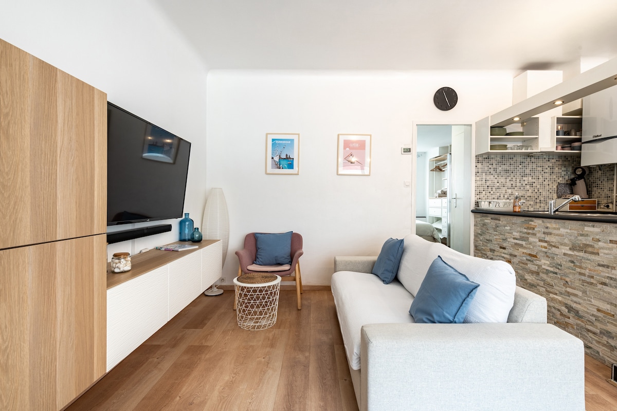 Welcome to Studio Le Plumard Bleu. Ideal for workers or couples, free street parking, 3 min from the highway, 10 min walk to the train station, free bus 50 m away takes you to the beach (C3). Quiet neighborhood, perfect for remote working (Wi-Fi). Bright studio (with shutters) located in a completely renovated (thermal and functional) post-war building and rated 2 stars. It is distinguished by its design combining custom spaces and elegant and sparkling decoration.