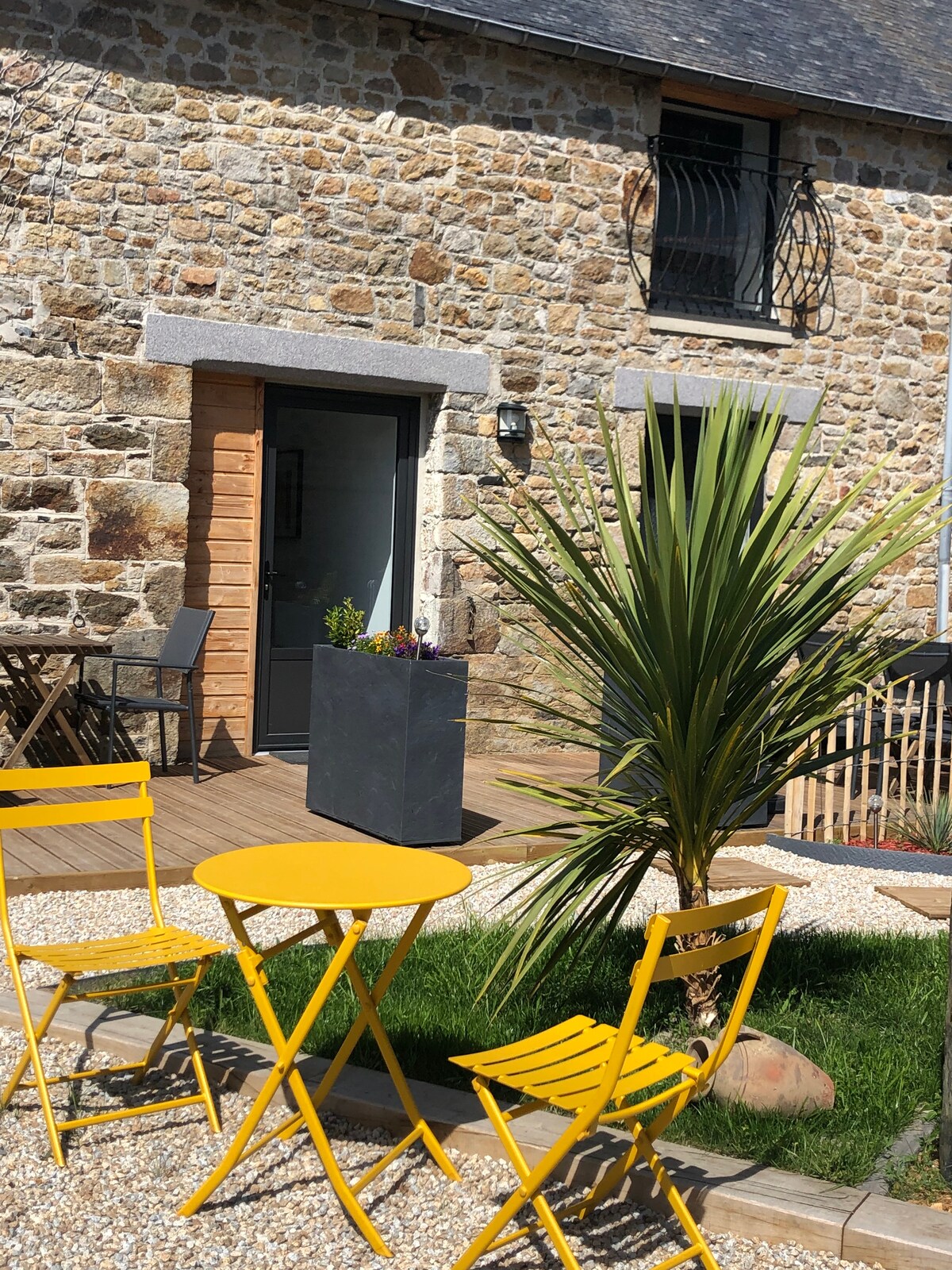 Spacious studio with sleeping area, seating area and kitchenette in a quiet and pleasant setting within a renovated old farmhouse. Large Queen Size bed 160. Kitchenette. Great location Terrace Wi-Fi Private Parking Bike room Ideally located in the heart of Mont Saint Michel Bay