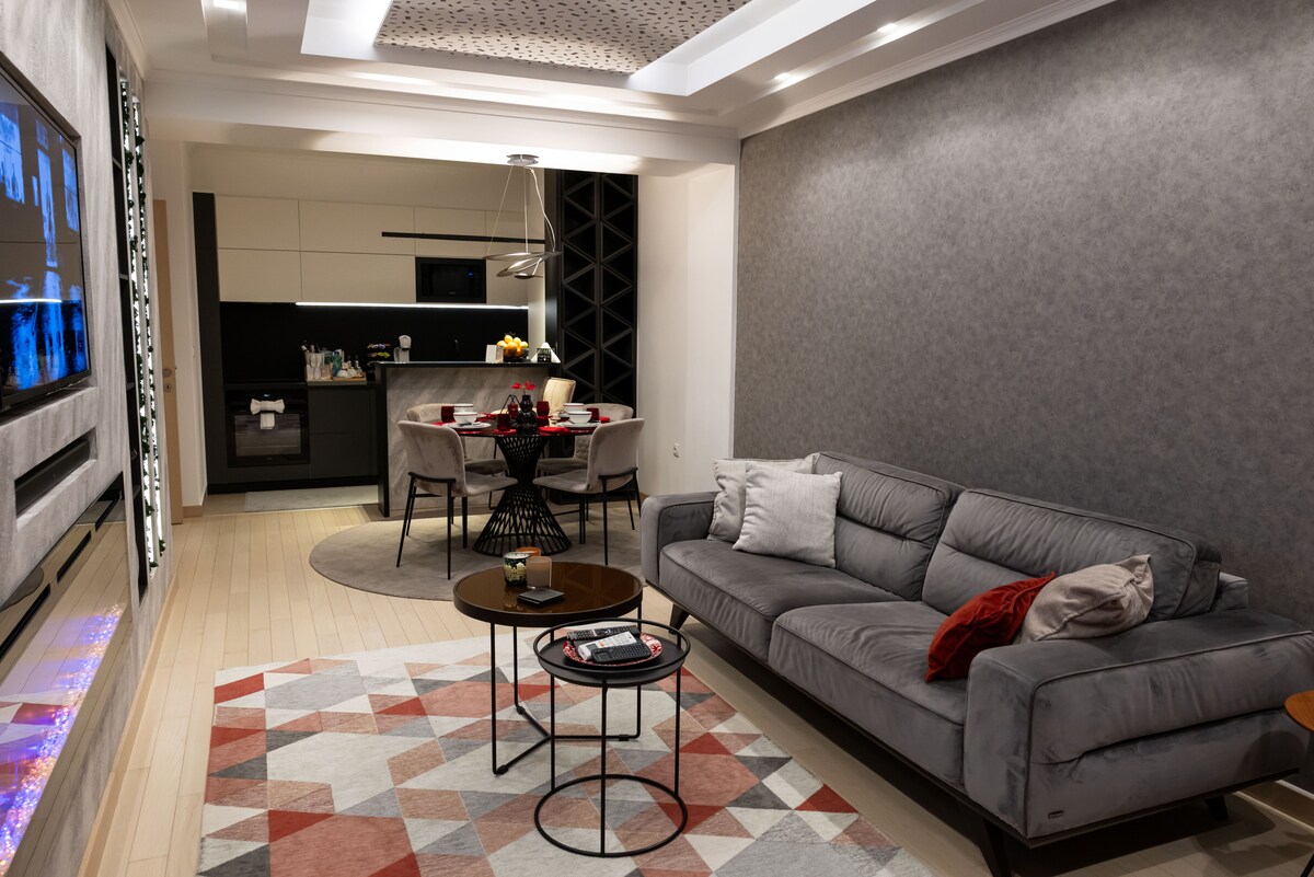 The apartment is located in one of the best neighborhoods in Skopje in a new and a modern building with an elevator at the 5th floor On your doorstep: nice and famous cafés, restaurants, Skopje City Mall, supermarkets, farmer's market, bakeries. Easy access to "Boris Trajkovski" sports and concert hall! Conveniently explore Skopje on foot: - 1.9 km to the famous Bohemian street's restaurants and bars ("Debar Maalo" neighborhood) - 2 km to the lovely green City Park - 3 km to the main square