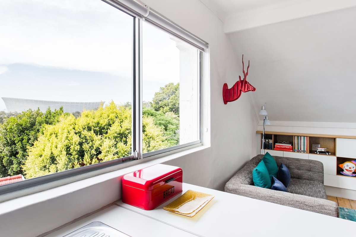 Enjoy a stylish experience at this iconic and centrally-located apartment building. Nestled on the main road of a tree lined suburb, 10 minute walk from the V&A Waterfront, Two Oceans Aquarium and Green Point Stadium. Restaurants, grocery store, deli, hairdresser, barber, laundromat all in the same street. Prime location! We have loadshedding backup. *Please note: Construction is taking place across the road, with noise related to this from morning to 5pm, Monday to Saturday.