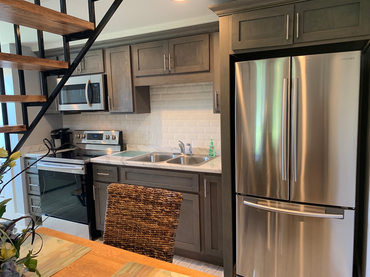 Reconnect with nature at this unforgettable escape. Green River Breeze is a new custom built 4 season treehouse. This space allows you to immerse yourself in nature while enjoying all modern amenities of home. Suspended among the trees you will fall asleep in the loft on a king size bed. You will find a fully equipped kitchen, private bathroom and small living area BUT the real beauty is the expansive deck and outdoor firepit.