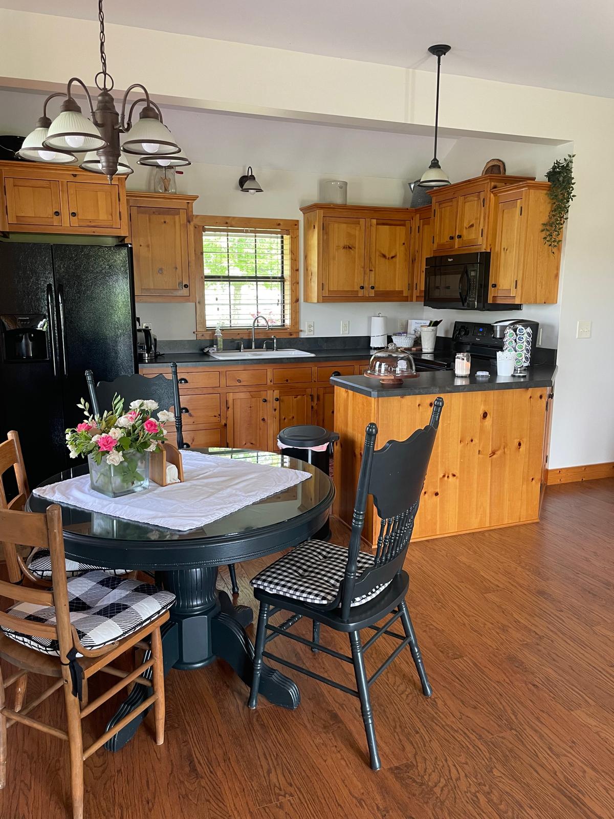 This is a little cottage in the middle of town. It is an open floor plan with 1 king bed, 1 couch and roll-away beds available upon request. Enjoy the convenience of being able to walk to everything in town and the serenity of a rustic themed space. Just steps away from some beautifully restored buildings and convenient to the towns lake and walking trails. No pets or smoking inside.