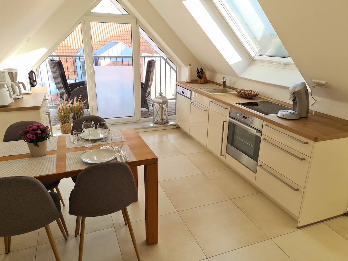 The small, or "Lütje" apartment is located on the 2nd floor, on the south-east side of the house and was newly furnished in late 2020 in a modern, cozy East Frisian style. The apartment has a car parking space by the house. To get to the upper floor, you have to climb a steep staircase.