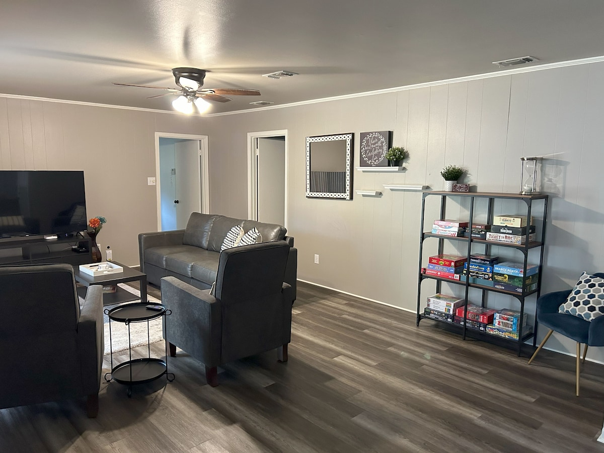 Josie’s Haven is the perfect place to stay for families, groups, and contractors working on a projects. The home is spacious, clutter free, and conveniently located a mile from town and less than a 2 minute walk to Kilgore College. Perks: Office set up with printer, 3 king beds, 1 queen, 1 full, and a convertible couch. Private backyard, less than $5 food delivery, private park across the street and less than a block from college police station.