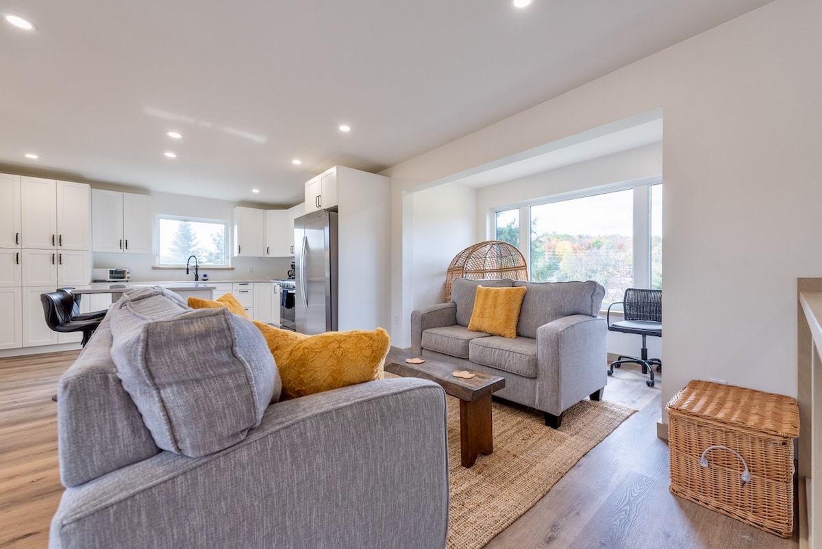 PLEASE READ! Mt. St. Louis & Horseshoe Valley at doorstep! This is a bright, large and private walk-out GUEST SUITE (basement apartment). Hot tub, patio, fire pit & secluded path in the woods to enjoy nature. Kitchen is equipped with an induction cooktop and all things necessary, even wine bottle opener:) Open concept living room/kitchen/dining room with TV & Roku. Bedroom is a work of Art: dark, mysterious and romantic! Custom Queen bed made from weathered barn wood salvaged from our property.