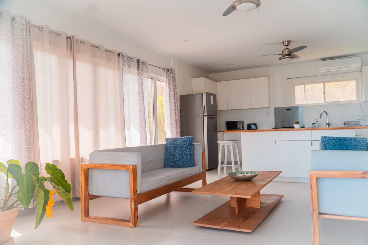 Comfortable refurbished studio apartment with kitchen dining room and large bedroom with en-suite bathroom. Super modern space with extra day bed/sofa for child sleeping. Own private sitting area at the back of the house next to large lawn space. Back gate leads down to Dr Grooms beach less than 2 minutes away. Quiet residential area near to the airport. If your looking for a long term rental, working remotely perhaps, this studio is ideal with discounts available NOT quarantine approved