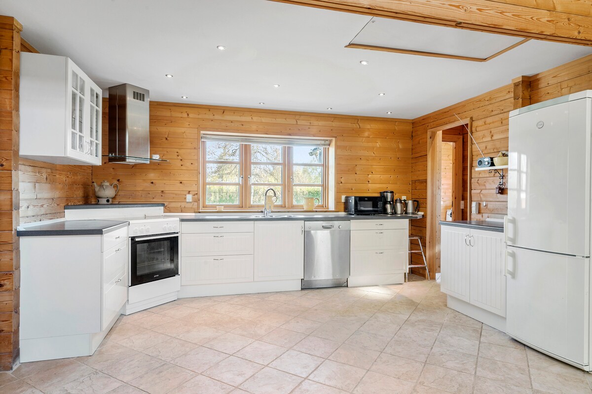 Come and enjoy the tranquility of the countryside. Beautiful bright home with views of meadow and forest from all windows as far as the eye can see. Beautiful light in the living room all day, from which deer, hares, and various birds can be seen. Fully functional kitchen with filter tap for purified water and dishwasher. Out in the big garden, which is wild on purpose, there is a fireplace, swings, trampoline and sandpit. In the house, there is a baby chair and toys.