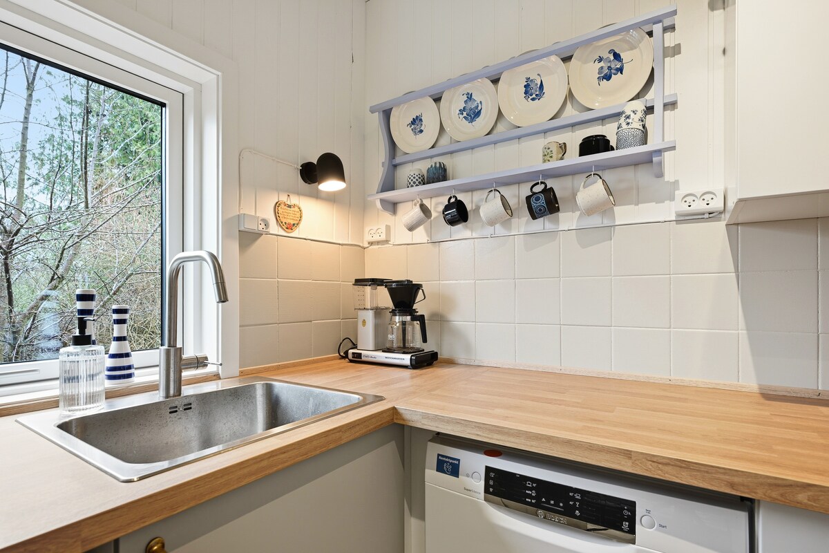 Nice cottage of 90m² with loft in quiet surroundings, close to the fjord and a beautiful common area with a jetty in the summer months. There is no view of the water from the house. Everything is included in the price, electricity, water, towels, bed linen, tea towels, and basic foods such as oil, sugar and spices. The wood-burning stove is the main source of heating, there is electric heating in the bathroom, a little underfloor heating which is turned on when the electricity is cheap. The garden is completely undisturbed with room for games, sports and play.