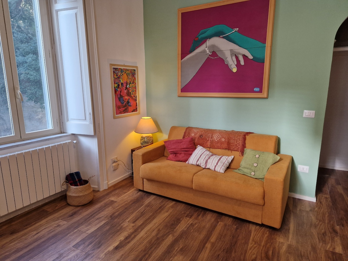 Charming apartment in Naples city, in the Petraio area (ancient stairs), located in a quiet place on the top floor, without elevator, with magnificent terrace overlooking the sea on the Gulf of Naples (from the Vesuvius volcano, to the island of Capri, to the hill of Posillipo). Spacious and bright living area with sofas and majolica kitchen, indoor dining tables and outdoor table on the terrace with gulf views. Sleeping area upstairs with panoramic double bedroom, bathroom and study/relaxation area.