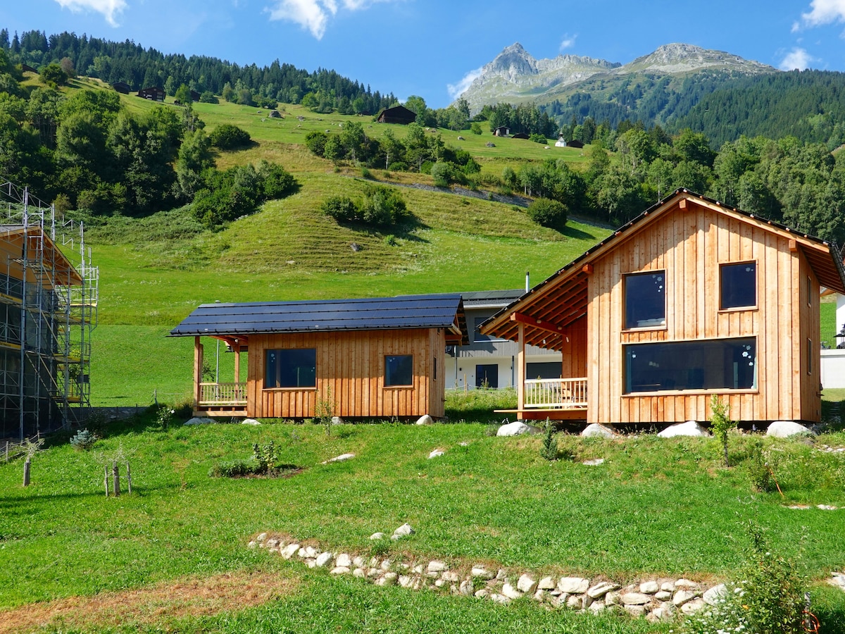 Stiva pintga Rabius Quiet, built on Bündner granite and in a beautiful panoramic position stands the small wooden house. Bright, light-flooded rooms, healthy living comfort, your own wooden house with a gallery: For you, this means relaxing, leaning back and enjoying your vacation - just being at home! Large windows and the balcony open to a view of the beautiful mountains of the Surselva.