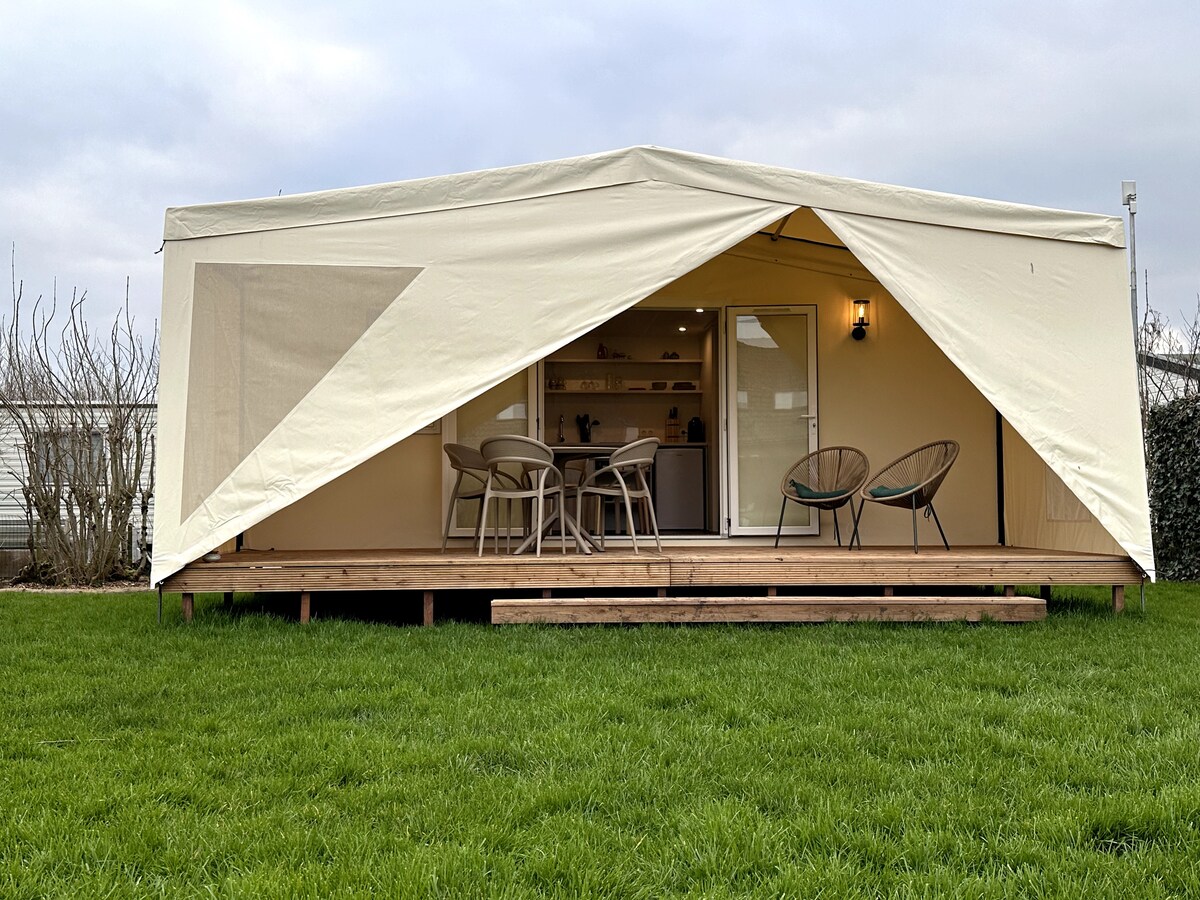 Luxury safari tent on the quiet mini campsite Petit013. We put hospitality, luxury and comfort first. The tent has its own luxury bathroom with shower, sink and toilet. The kitchen is fully equipped with dishes, cookware and kitchen towels. There is bed linen per person, and the bath towels are ready (included in the price). Come and enjoy the peace and quiet. Wake up in the morning in the sun on the terrace. In the evening, have a drink in the evening sun on the seat behind the tent.