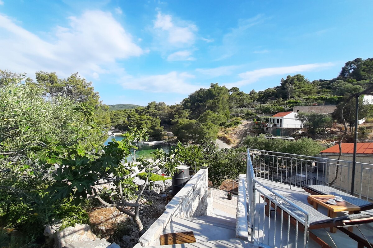 Placed in the Sajtija bay, ten minute ride on a macadam road from the charming village of Gornje Selo. Just a few steps from the sea, the terrace gives a beautiful view of the bay and clear sea. Peaceful enviroment with only few houses in the neighbourhood offers a perfect vacation for couples with, or without children. - We use solar panels in house. - Beside the house there are two private parking spots. - The closest grocery shop is in neighboring village, 10 minute drive away.