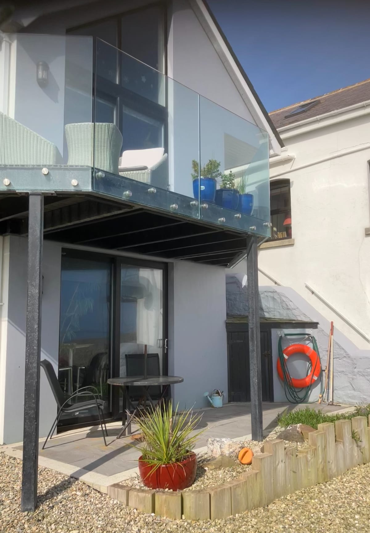 A perfect waterside getaway all year round for two. On the waters edge, giving commanding views out to sea, mountains and panoramic views. Only 5 mins drive from a large market town and 20 min to Belfast city. Dog friendly. Close to leading golf courses. Stylish. Vaulted ceilings, Large floor to ceiling windows, doors open out to large terrace south facing for sunset drinks or bbq and a balcony area from master suite. Outdoor seating for chilling or dining. Wood burning stove in living area.