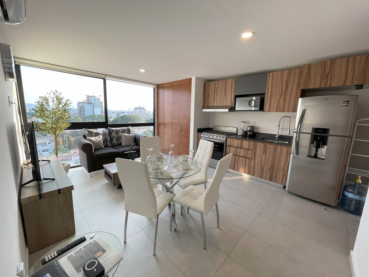 Apartment located on the 9th floor, elegant and centrally located, offering a beautiful view of the city, a unique and comfortable space for travelers looking for an unforgettable stay. The apartment is located in the heart of Guadalajara, Chapultepec/Americana area, offering easy access to the city's most popular attractions, including historical sights, the best gastronomic and cultural area (cafes, markets, bars, etc.). We have 2 terraces, a swimming pool and a firepit.