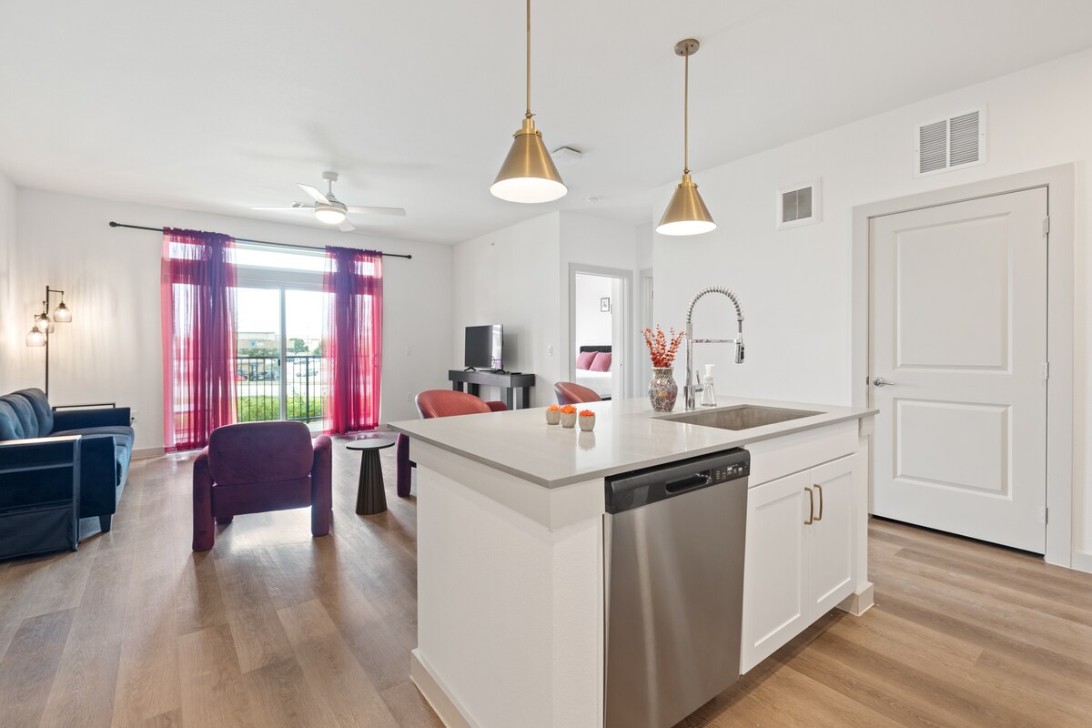 Bright and comfortable 2-bed, 2-bath apartment at The Merriman in San Marcos. It features a spacious layout with wood flooring, modern lighting, cozy living area, smart TV, and a private balcony. The kitchen includes stainless appliances, quartz counters, and an island. Bedrooms offer king beds and ample closets. Guests enjoy access to a resort-style pool, fitness center, coworking areas, lounges, and game room, with nearby dining and shopping.