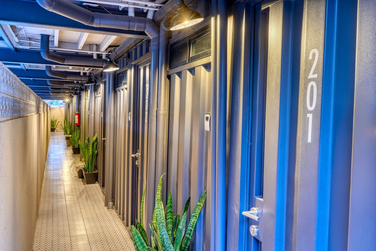 Discover a suite made in shipping containers, a unique ecological proposal in Mexico developed by the Container Living office. Enjoy all the amenities, including air conditioning, free parking on the premises, city views, and quick access to the city's main avenues. Perfect for business or leisure trips as it is a quiet and safe place, but has all the amenities just a few meters from the property.