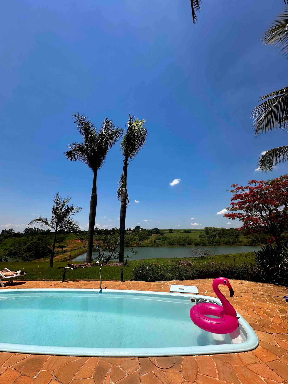 Fácil acesso. Santa Maria, saindo de trindade. Represa, pode pescar. Piscina de 8m, aquecida com cascata, playground infantil. Total de 4/4. Sendo 4 camas queen + 4 solteiro + 2 colchões solteiro. Ar cond. em 3/4. Todos quartos c/ ventilador. Roupas de cama. Cozinha completa (NÃO tem airfryer). Purificador água. Tv 42”. 2 sofás. Churrasqueira a carvão. 6 mesas quadradas c/cadeiras. Mesa jantar 10 lug.Proibido JetSki. Freezer 200L horizontal.