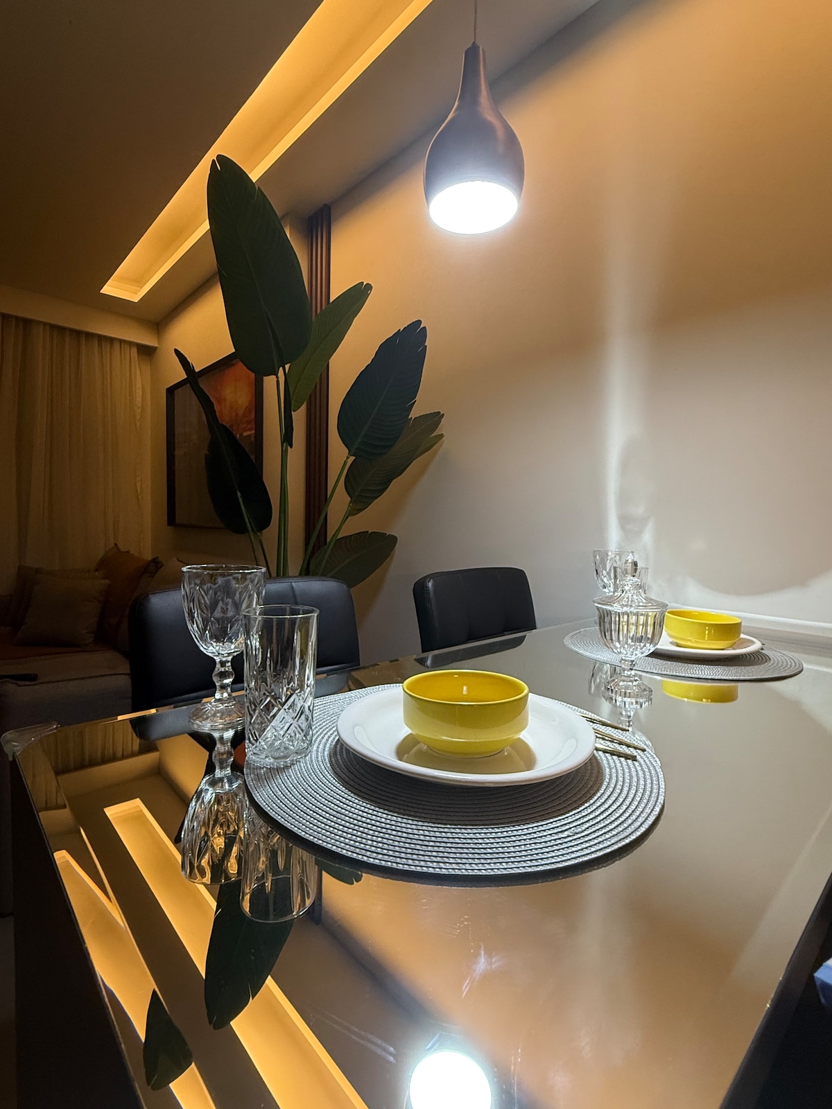 Apartamento novo, garagem inclusa, confortável, estiloso e completo. Wifi de alta velocidade. O piso térreo da acesso a diversas lojas, restaurantes, mercado 24 horas ao lado. A trabalho ou a lazer, a comodidade de ter tudo por perto. Projetado para receber tanto estadias curtas quanto longas. O condomínio Helbor Patteo Bosque Maia, possui localização privilegiada, próximo aos melhores restaurantes e bares e em frente ao Parque Bosque Maia..