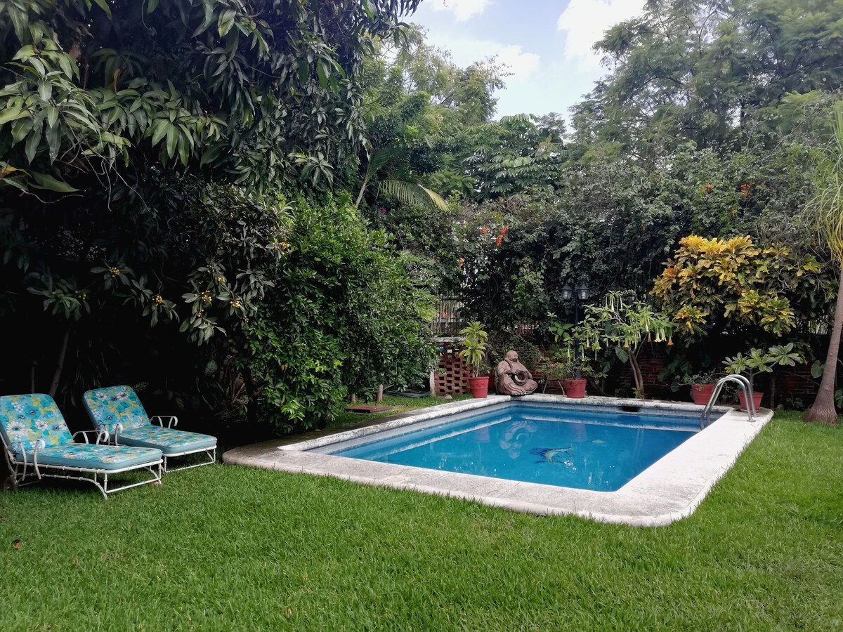 Amazing house in one of the best areas of Cuernavaca. You can breathe tranquility in this house. There is no noise from outside, other than from nature. It has a beautiful garden and a large pool area with lounge chairs. The house is fully equipped with air conditioning, wifi, television, netflix, etc. The perfect place to relax!! There is another house on the property, but they are completely independent and each one's privacy is respected.