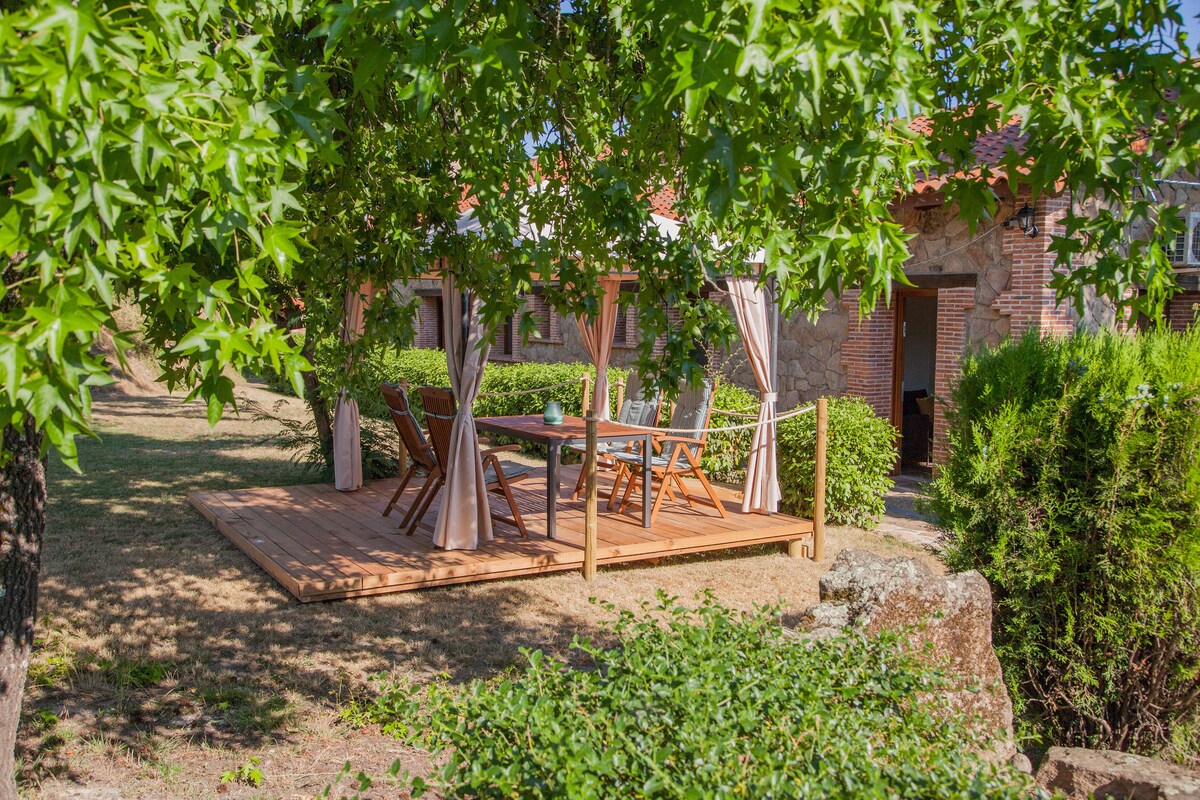 Casita -Madera Vieja-Nature&Relax- located in AMAVIDA (Ávila) has 2 large outdoor areas, a 40m2 patio that gives entrance to the house and a 100m2 back garden with swimming pool and barbecue area. All for private and exclusive use of guests. Centennial house built in 1900 that retains all the charm of the past. Enjoy hiking trails, the tranquility of the village and the sound of nature. Connect with the calm and tranquility of the place.