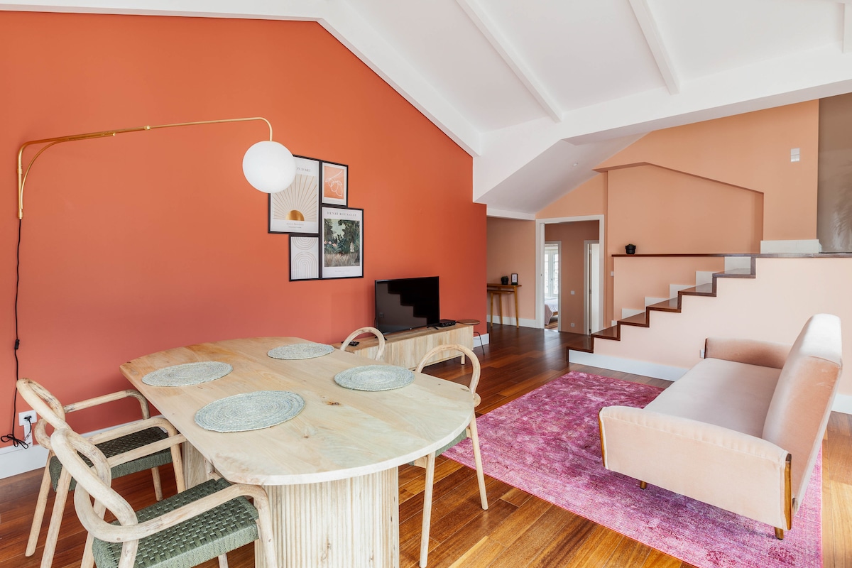 Enjoy this stylish and very central 2 bedroom new apt with private terrace inside a historical building from the 40s. It's perfectly located in Batalha, close to everything in downtown, metro 5 min. away. Decorated with original paintings, it has a modern ambiance and new windows with classic details. Fast Wifi in all areas, equipped kitchen, A/C, washing+drying machine, 1 double bed, 2 single beds and comfortable sofa-bed. Perfect for families and all city lovers who want to explore Porto.