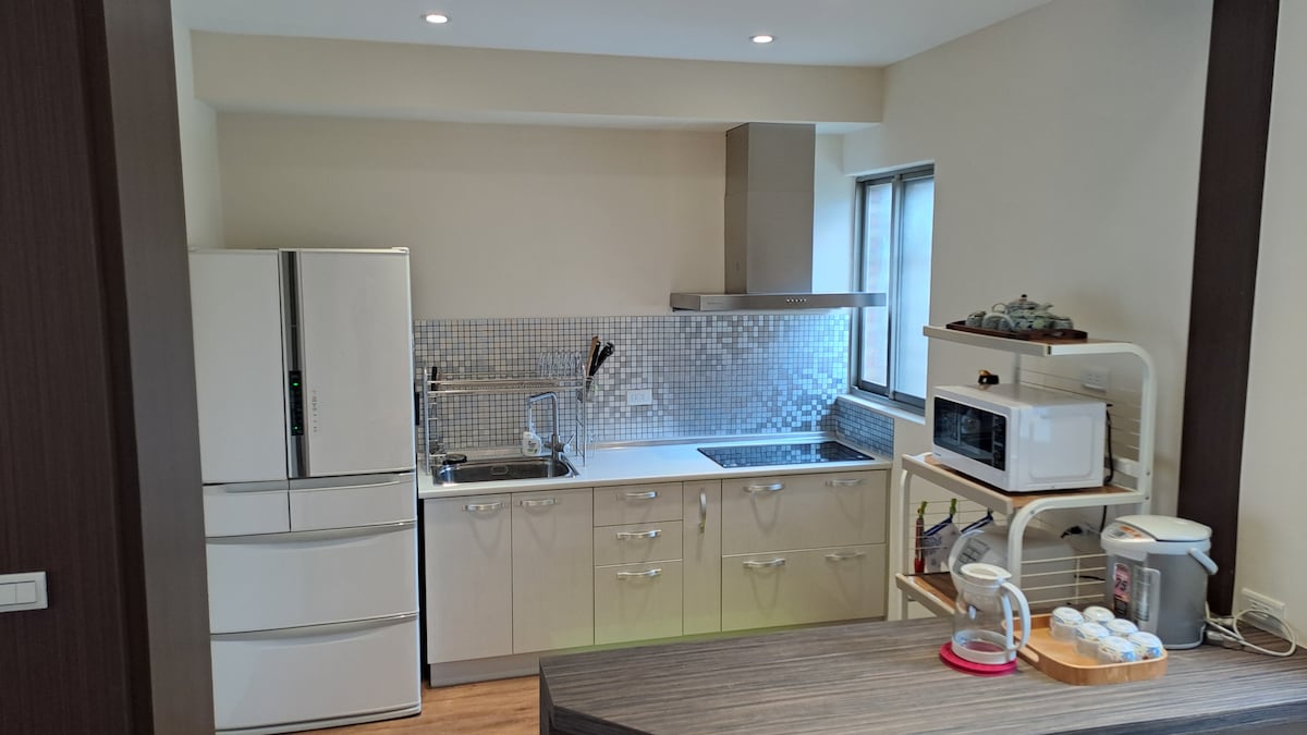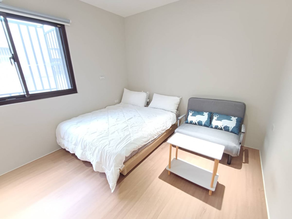 All the luck comes from a dynamic idea: "Renovate a studio and private guest house"!!! Then, a beautiful living room with a huge TV screen, a spacious study, and a dining area where you can chat about right and wrong took shape. Group fun, doubled! I also decided to share my home with travelers from afar. Convenient transportation, 1 minute from the Nankan interchange, convenient to go south and north. Jingguo Transfer Station is 100 meters away. The bus stop is at the intersection, and you can travel to Taipei and Taoyuan. There is a UBIKE downstairs that can be rented to explore Taoyuan along the many bike paths around. It takes only 10 minutes to ride to the most beautiful Taoyuan General Map and Nanping Street Food. If you like sports, bowling alley, skating world 3 minutes walk. The whole house is a private space. Open study, WFH is fine. You can sit on the windowsill and read a book or use the sofa bed. Fully equipped kitchen for cooking at home. The large terrace is perfect for a garden breakfast. The studio is suitable for long and short business trips and travel. No more being stuck in a small suite. Enjoy the comfort of home while traveling for business. Also great for families or several friends to book the whole house and gather in one room! There are three 7-11s nearby and 2 popular private cafes downstairs. And a self-service laundry shop. Or ride the YouBike downstairs to forage on the nearby streets. Welcome to be our guest. Beautifully decorated home, high-quality space, please cherish it. # Please let us know where you are from and the purpose of your trip when booking. # Parking is available, please let us know in advance.