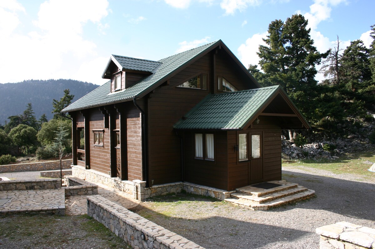 Wooden two-storey chalet literally in the forest at an altitude of 1300 meters. Just 15 minutes from the center of Kalavrita and 15 minutes from the Ski Center, with incredible mountain views The main area has 2 bedrooms, kitchen, dining room and living room with fireplace as well as 2 bathrooms. The guest house with a separate entrance has its own kitchen and bathroom, and accommodates 2-3 extra people in an open space. *The Guest House is only available for reservations of 5 people or more.