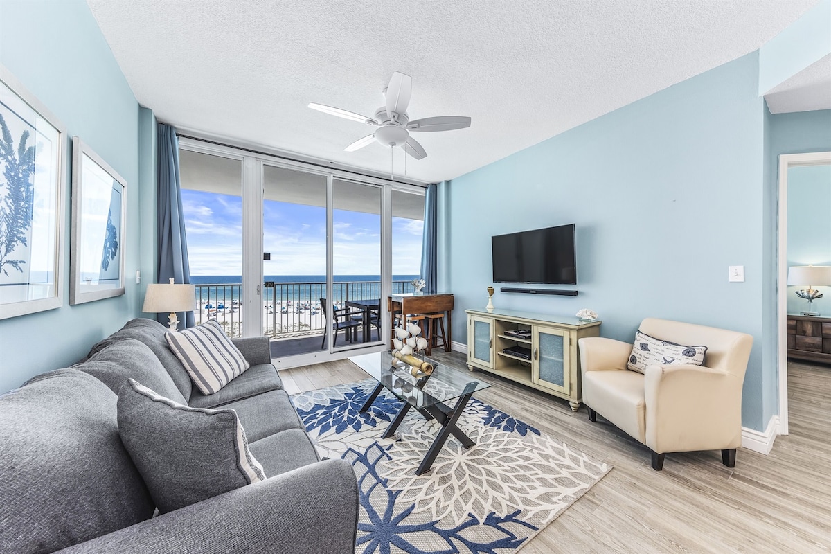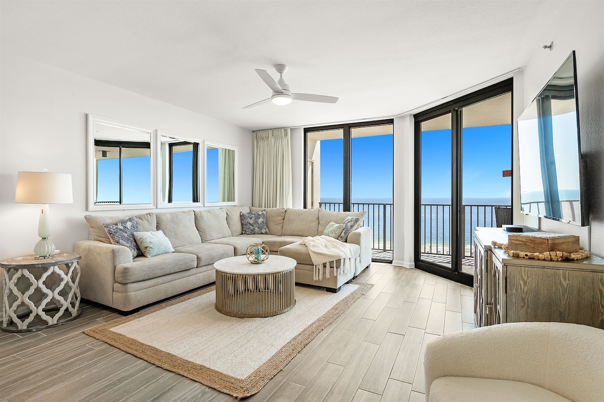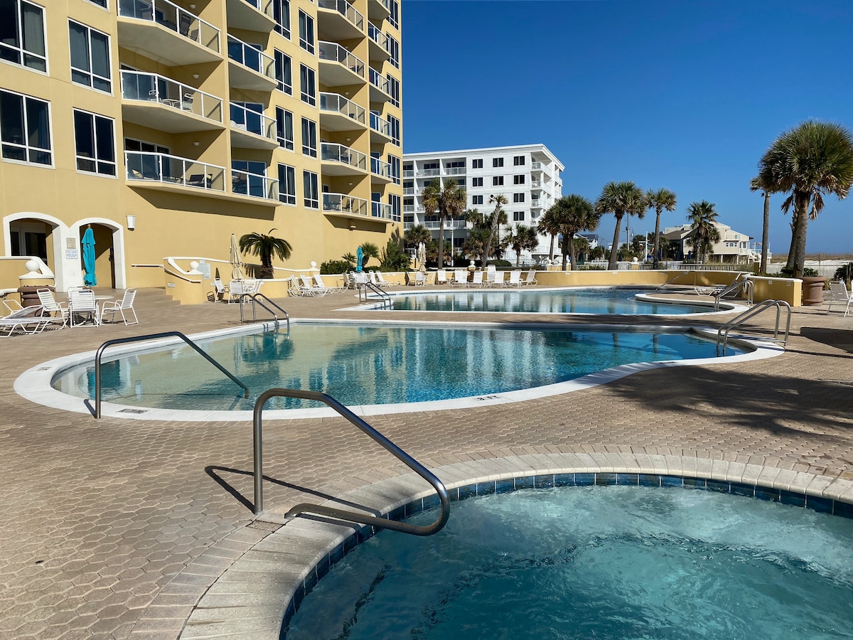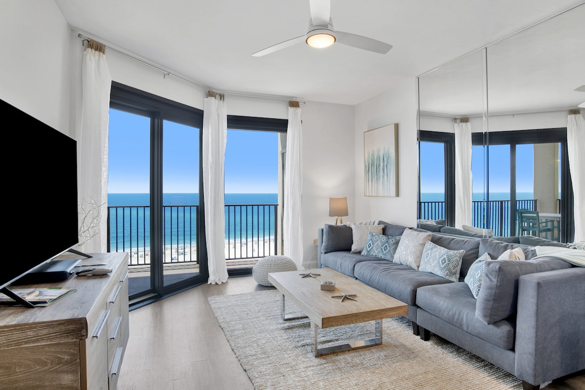 2 bedroom 2 bath condo in Phoenix VI, sleeps 8. Perfect location with oceanfront views on 14th floor. This unit boasts impressive views of Perdidio pass, so you can enjoy watching the dolphins from your beach front balcony. Bedroom 1 ( king bed) Bedroom 2 ( 2 queens) Sleeper sectional with pull out memory foam mattress. Amenities include (indoor/outdoor pool, sauna, fitness center, racquetball court, and tennis/pickleball courts) * $55 parking pass required at check-in.