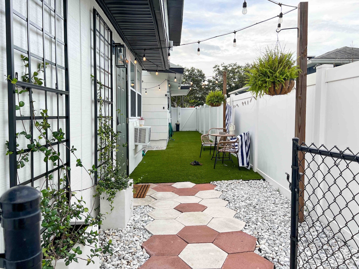 Welcome to this centrally located St Petersburg guest suite. Our renovated guest house is located less than 10 minutes from Downtown and less than 10 minutes from Treasure Island Beach. You will be an 8-minute walk to the St Pete SunRunner - connecting St Pete Beach with downtown. The apartment has been carefully designed to include everything you will need to make your stay as comfortable as possible including private parking, a private side entrance, and an enclosed private yard.