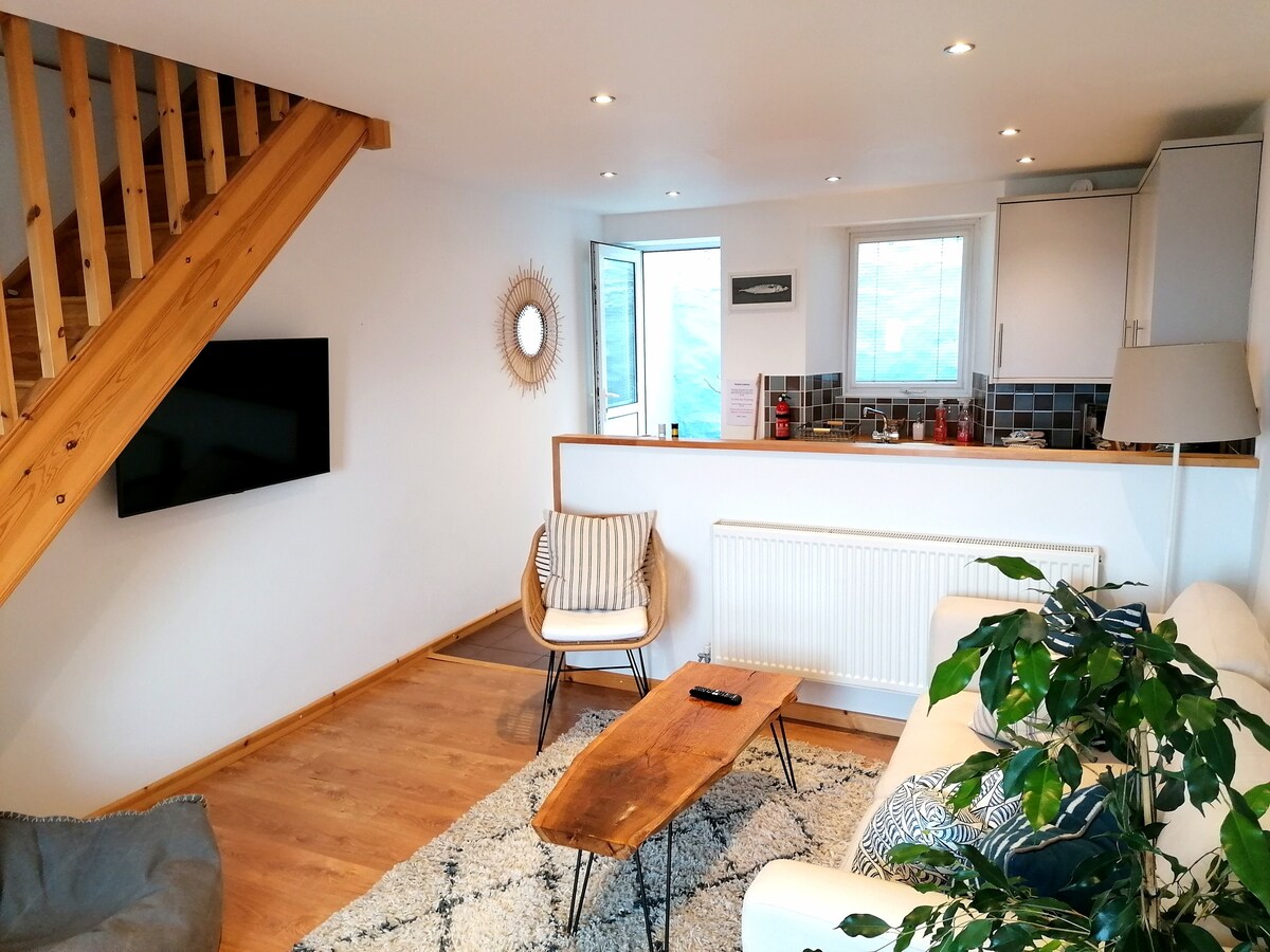 Fantastic High Spec Luxe Penthouse. Bifold doors open from the kitchen/living room onto a private south-facing balcony. The lower floor opens onto a deck with steps leading to a private garden. Modern fully fitted kitchen & living room with woodburner. Three bedrooms: Kingsized Master Bedroom; walk-in wardrobe, Double bedroom, and small double with an ensuite shower. Luxe Bathroom with walk-in rainforest shower. Hot Tub. (message for rate ) Superfast Fibre. Parking. BBQ. Dog friendly