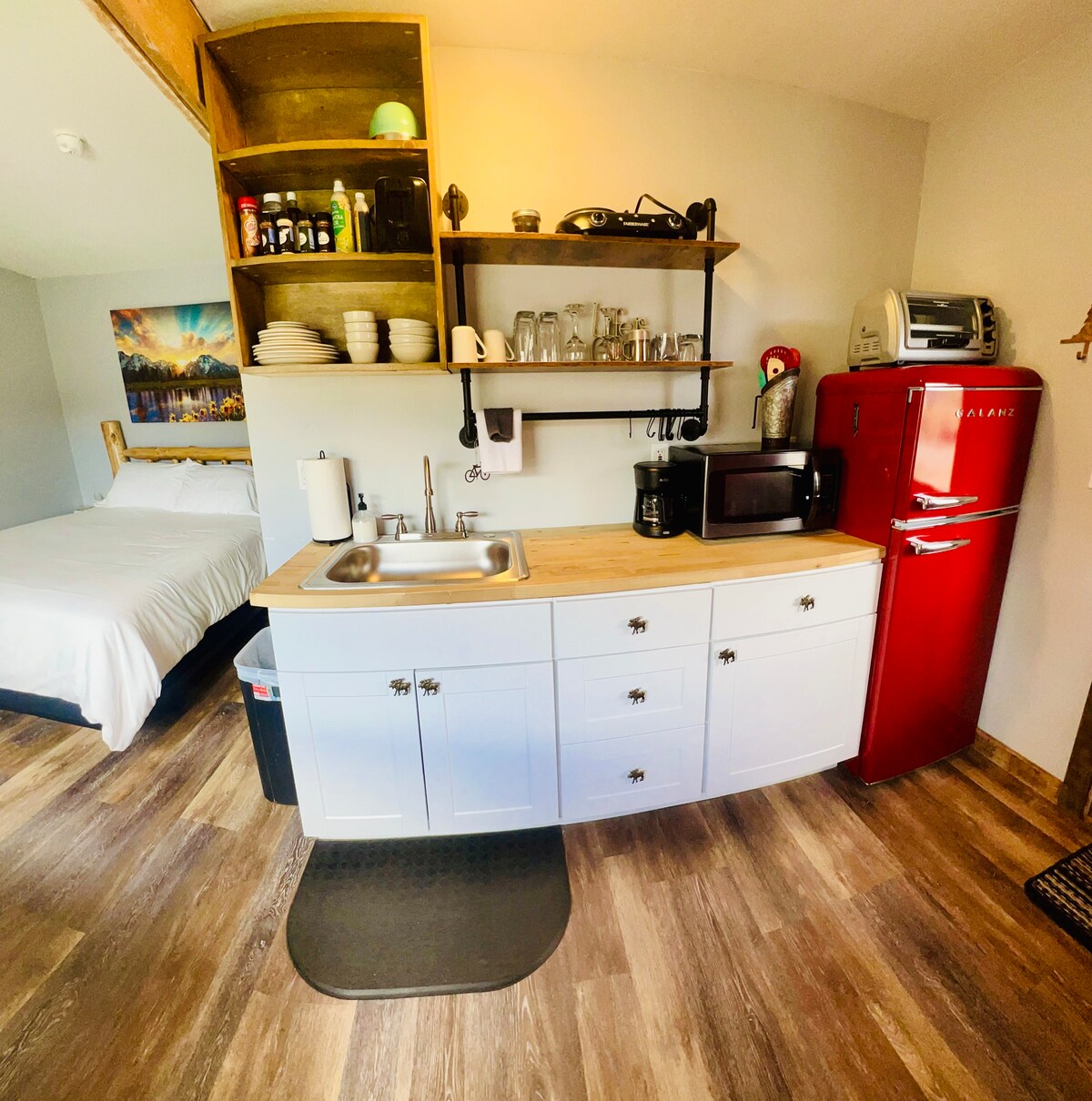 A quaint room with plenty of extra storage. A peaceful space allowing easy access to the driveway. The Bon-Ton was a name used for a mine that was once located approximately 8 miles above Pitkin on Cumberland Pass Road. 1 Full Over Full Bunk 1 queen sleeper sofa Full Kitchen