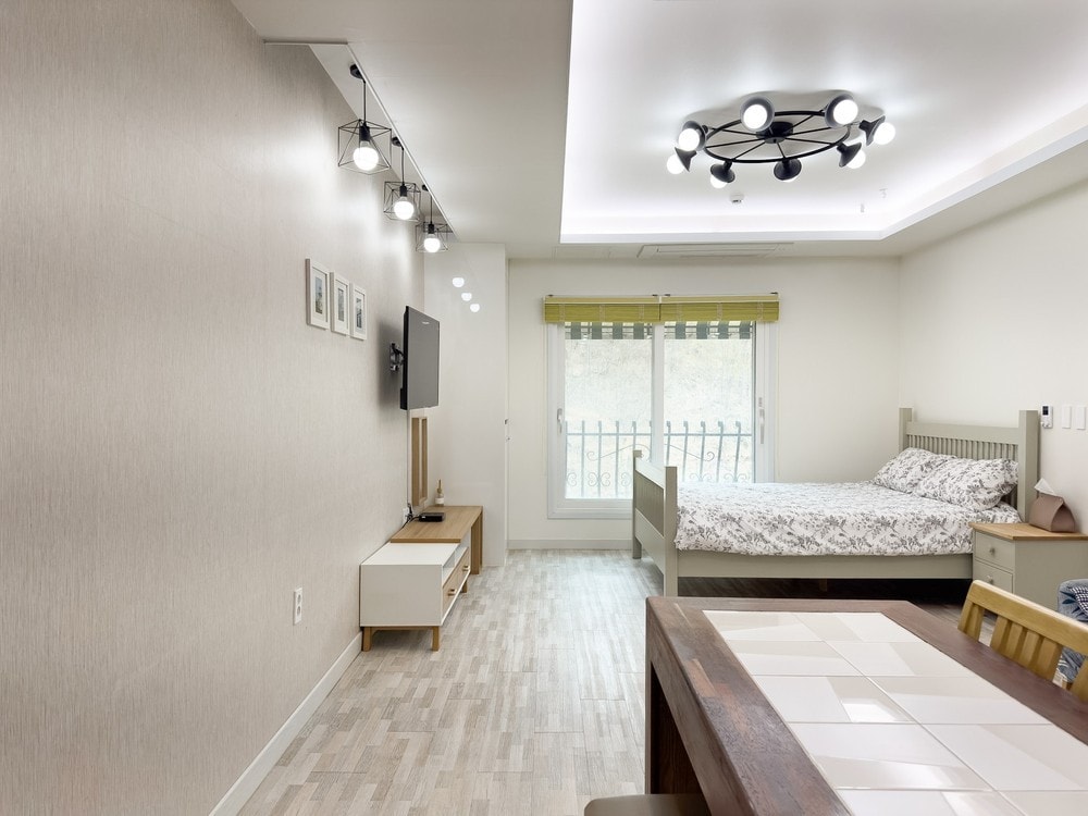 Haerang Naye is located in a place where the clear air and valleys of Baekunsan flow. It's a quiet and cozy stay accommodation. We value the privacy of our guests. Room 201 is a loft-style room with an internal staircase leading to the bedroom and terrace. Amenities such as a private open-air bath, a spacious terrace, and a beam projector are installed. * The small room on the terrace is equipped with a beam projector and a sofa bed, making it suitable for personal work or reading. For a pleasant and safe environment for our guests, charcoal (fire) barbecue is limited, but equipped with electric grill and burner We've prepared food that can be grilled or boiled. * A simple sink was installed on the terrace to minimize the flow of going up and down to the first floor. Relax with the whole family or lover at this peaceful place to stay. :)