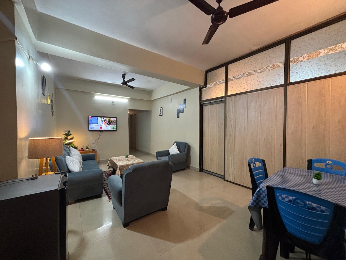 Relax with your whole family at this peaceful place to stay, organise family party and events. The property is a 1bhk apartment furnished with 1 bedroom with tv and king size bed, 1 hall with 1 bed, 1kitchen and 1 bathroom. All amenities are available for cooking and stay.