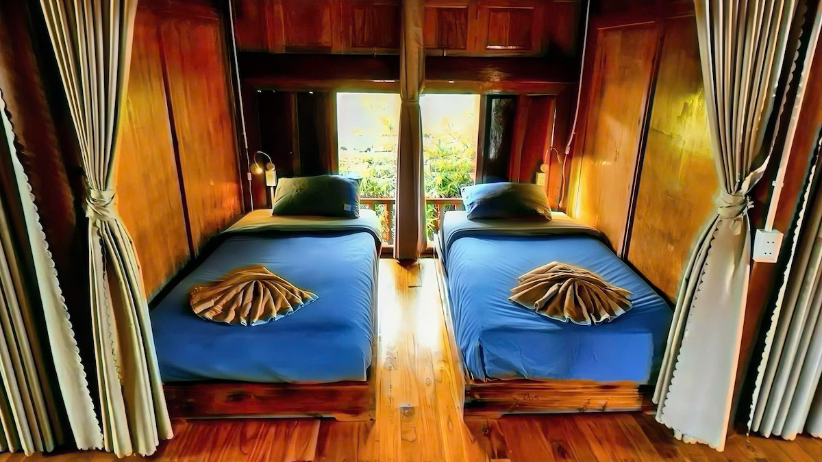Escape to the hills of Tha Village, Phuong Do Commune, where nature meets culture. Our stilt house, inspired by the traditional Tay architecture, blends rustic charm with modern comfort — featuring wooden interiors, a bathtub. We follow sustainable practices, limit single-use items, and use local products whenever possible. Stay in cozy queen or single rooms with private bathrooms nearby. Enjoy authentic local life — garden, cook, try Tay costumes, or herd buffaloes with villagers.