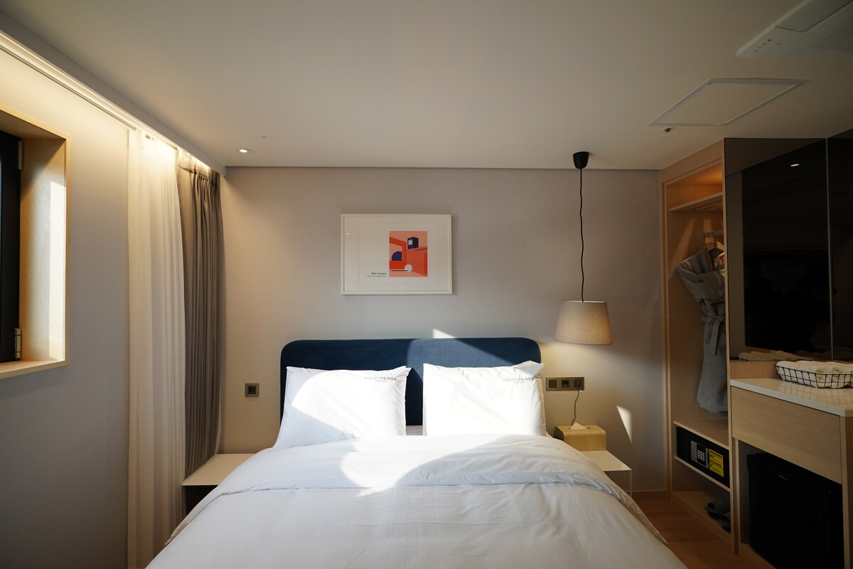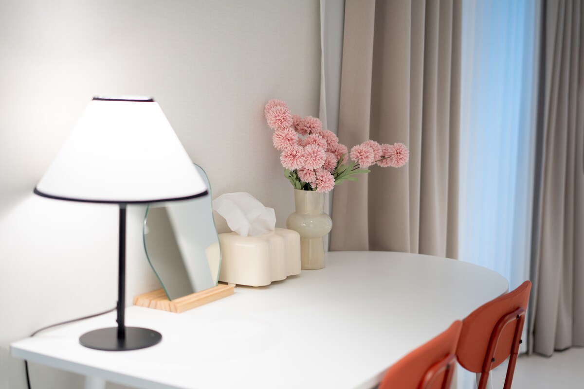 This is The House, a stylish one-room-type emotional accommodation close to Haeundae Beach. Haeundae Beach is a 3-minute❤️ walk away. It is❤️ a city view, and you can see the sea view from the veranda. This is a one-room accommodation❤️ for 2 people. ❤️ The interior, furniture, decor, and styling will make you feel cozy and comfortable. ❤️Facilities -Stand-type portable LG 55-inch smart TV (Netflix available) (personal account login), air conditioner, refrigerator, microwave, electric kettle, 1 queen bed, sensory blackout curtain, Woongjin Conway hot and cold water purifier, canoe capsule machine, Samsung induction - Shampoo/Conditioner/Body Soap/Hand Wash, Towels, etc. ※ Due to environmental policy, we do not provide toothbrush and toothpaste.