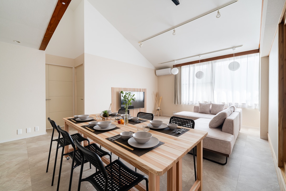 Umeno-Yuekigyou is a 4-minute walk from Dazaifu Station, with a convenient convenience store, supermarket within a 1-2 minute walk, and restaurants nearby, ensuring a comfortable stay. This is a luxurious rental of a newly built, modern Japanese-style detached house that can accommodate up to 11 people. Free parking is available for 2 cars, so you can use it as a base for your trip to Kyushu. The main bedroom is equipped with a projector with an electric screen, and we have a contract with U-NEXT, so you can enjoy your favorite movies and dramas on a large screen. You can also enjoy stylish dining and drinks in the balcony area, where chairs and tables are available. The large living dining room is complete with a wooden single board table that can accommodate up to 8 people, and the sofa is a hotel-specified high-quality L-shaped sofa, providing a comfortable sitting experience. We are fully equipped with a washer and dryer, so you will have no trouble doing laundry even if you are staying for consecutive nights or long stays. We have a Nespresso coffee maker to help you relax from your travels. A map of nearby restaurants is available in the guidebook, so please use it as a reference for your meal.