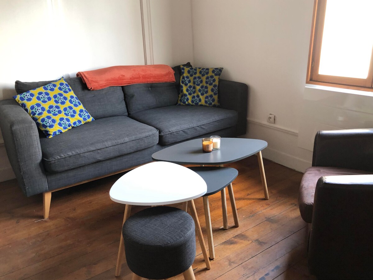 Charming and welcoming, our apartment has been carefully decorated. On the first floor of a private house, it can accommodate 2 to 4 people including at least 1 child because it has a double bed, 1 single bed and we can offer a 2nd single bed. Travel cot upon request. The kitchen is equipped with a hob, oven, microwave, fridge, Nespresso coffee machine, kettle and various utensils. Linens, towels, kitchen towels are at your disposal. Pets not allowed.