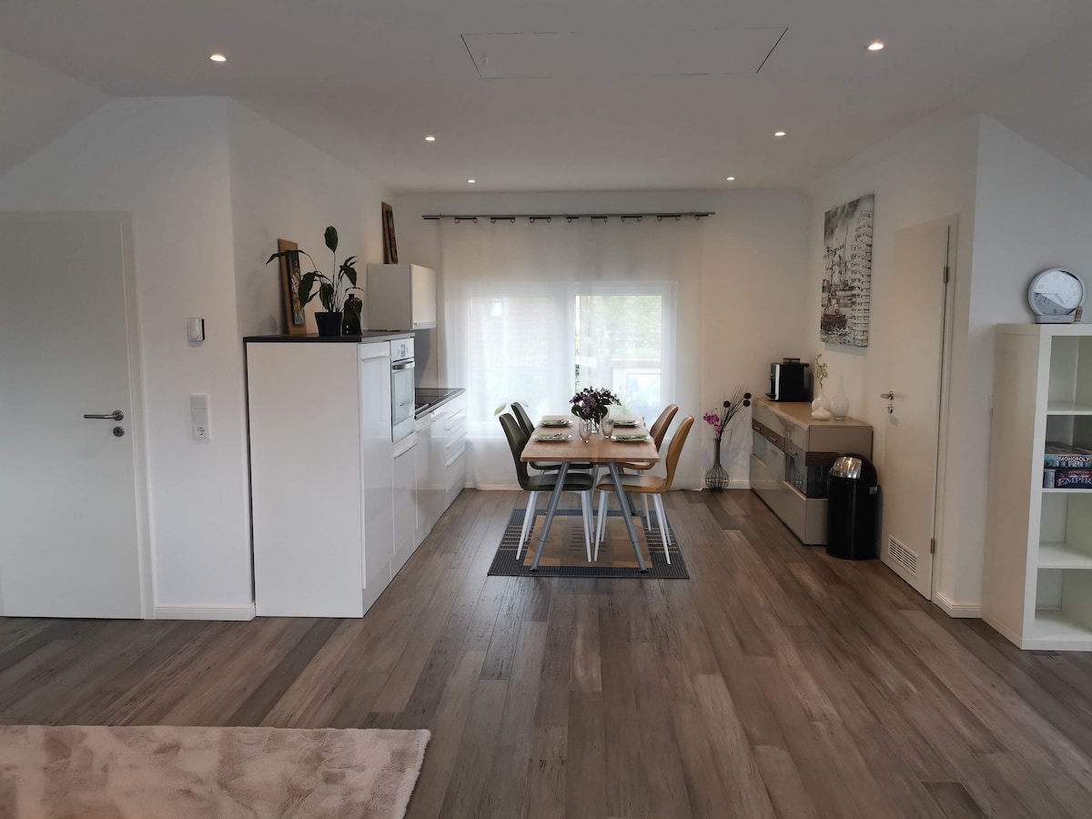 We rent a cozy, small, approx. 40 square meter apartment with a view of the countryside, which you can enjoy while having breakfast from the lounge seating area on the wooden terrace from the first floor. The apartment is perfect for two people, but can also be used for a short time with 4 people. The 186 bus stops right in front of our door and with the S-Bahn, which is about 1500m away, you are in the center of Hamburg. More information at hvv.de Cars can be parked right in front of the door.