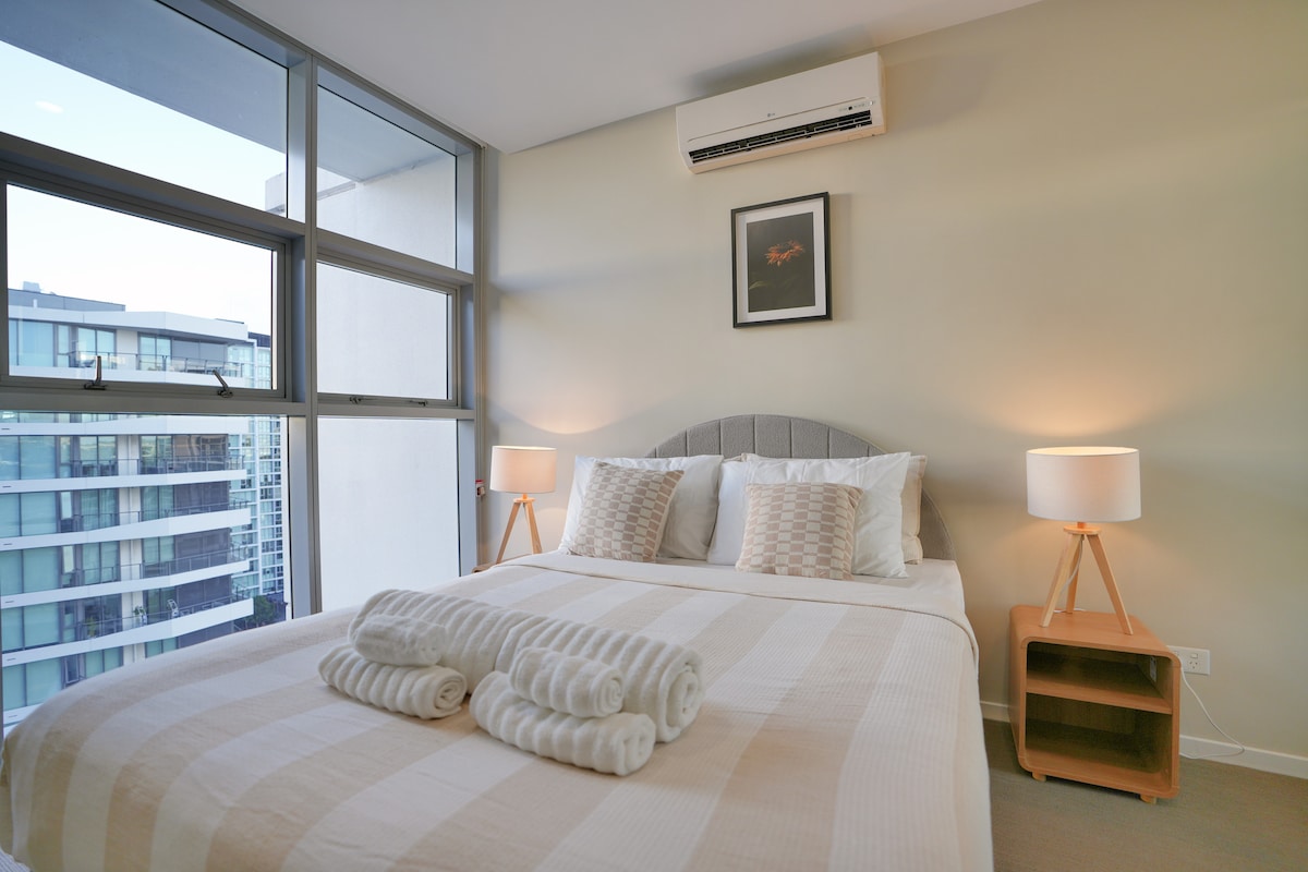 Large two bedroom 2 bathroom apartment, king bed (can be two singles on request only) in the main bedroom with ensuite and queen bed in the second bedroom, balcony. Smart TV in both main bedroom and living area. Full kitchen including dishwasher. Two Bathrooms with walk in shower. Washing machine and dryer. Free WI-FI and limited parking (fees apply) Upon check in, we do require government issued photo-id and valid credit card for a security bond.