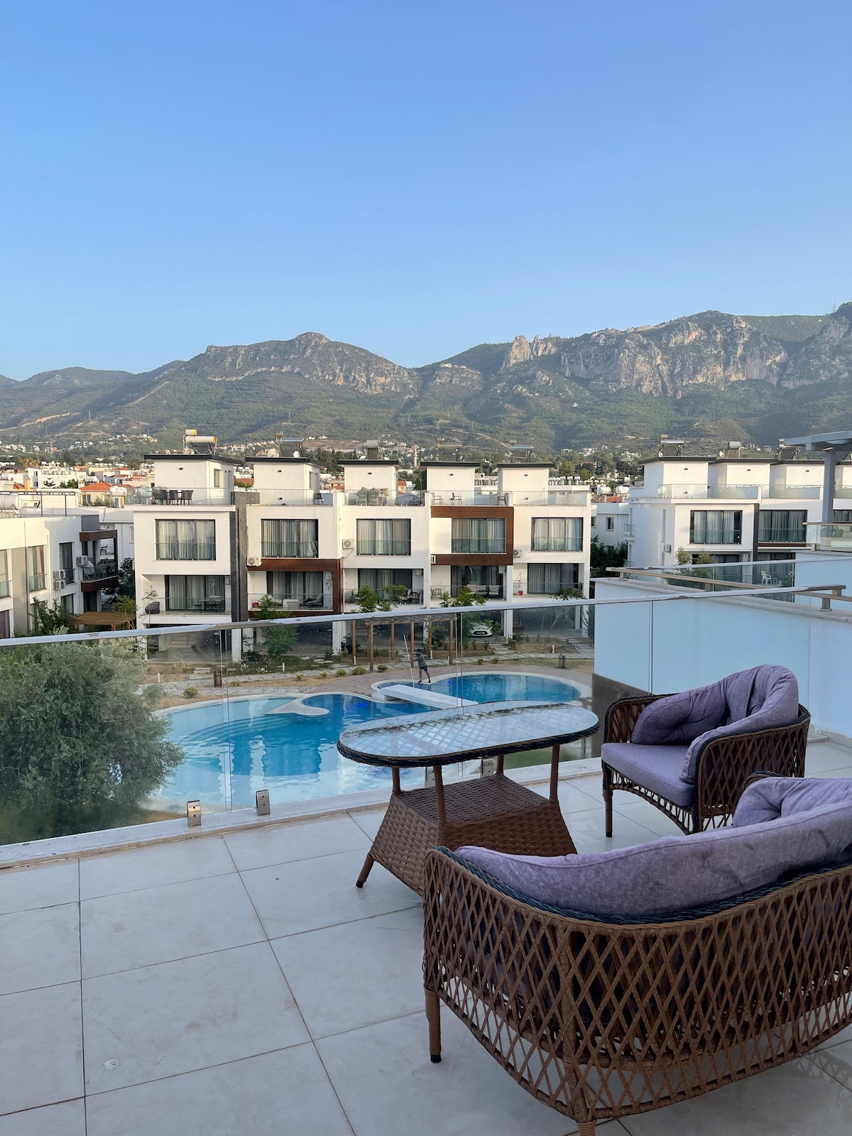 Welcome to your luxury getaway! This elegant duplex villa is just 2.5 km from vibrant Girne Harbour, 2KM to Less ambassadeurs casino and and Centre features 3 spacious bedrooms (2 double, 2 single beds) and 3 modern bathrooms Enjoy BBQ dinners on the large terrace with breathtaking views of the Five Finger Mountains and Zeytinlik olive groves. Cool off in the inviting swimming pool and relax in style.