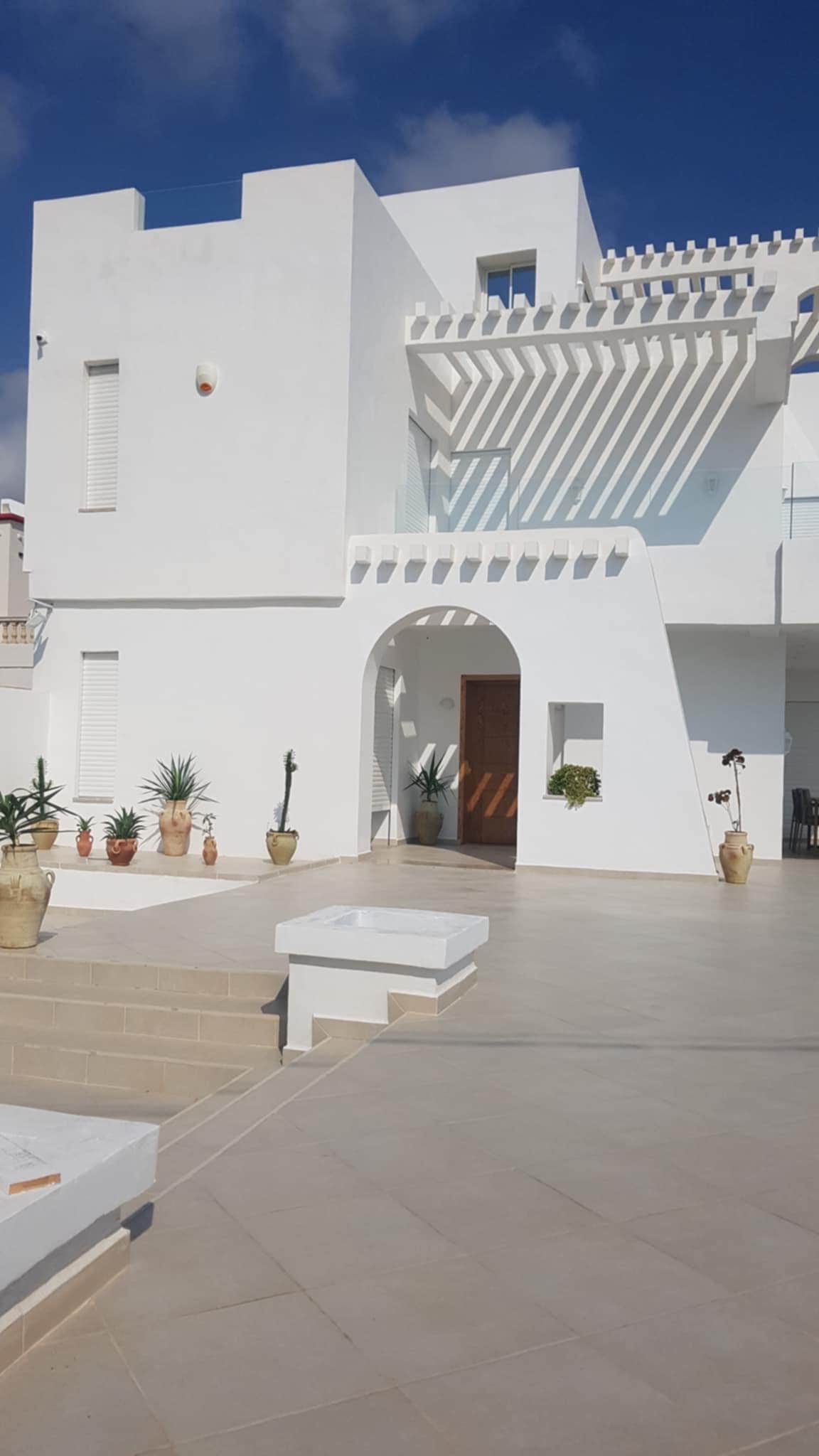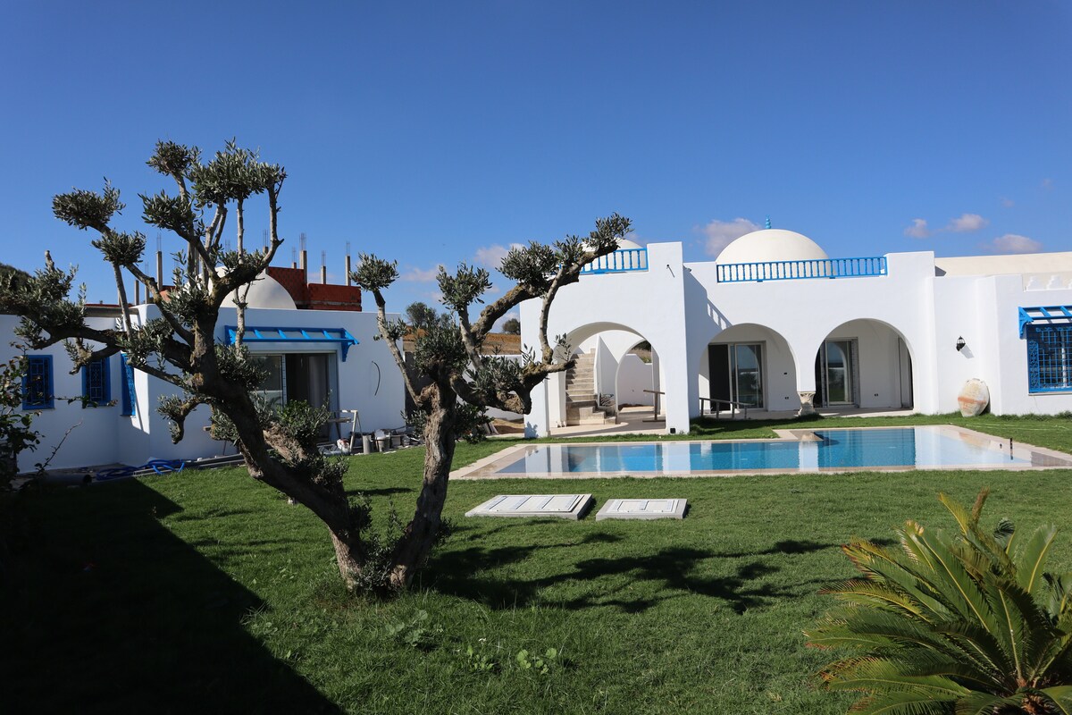 a master villa in the seaside resort of Kélibia la Blanche la Mansourah, a 5-minute walk from one of the best beaches in the world, located on a plot of 800 m² equipped with an infinity pool, including suites and stays with noble materials and refined furniture