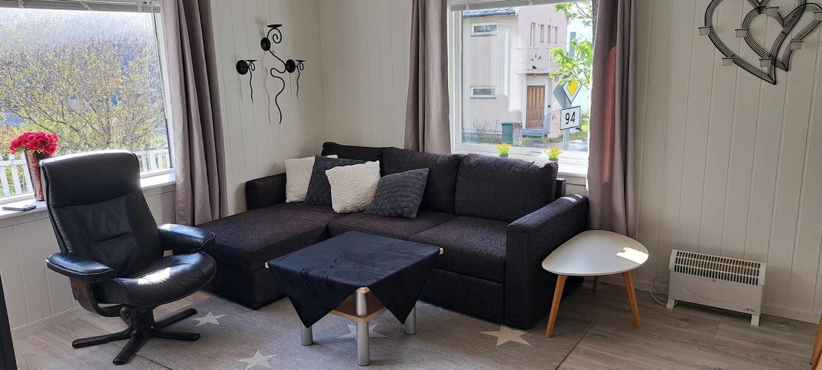 The apartment, built in summer 23, is modern with a fully equipped kitchen, a living room featuring a sofa area and TV, a cozy bathroom with a shower, a hallway, and a bedroom with a custom-built 150 cm bed. All rooms offer views of Hammerfest harbor area, Melkøya, and Håja. It's located on a side street, just a 5-minute walk from the city center. Unfortunately we don't have parking outside our house because the street is so narrow.