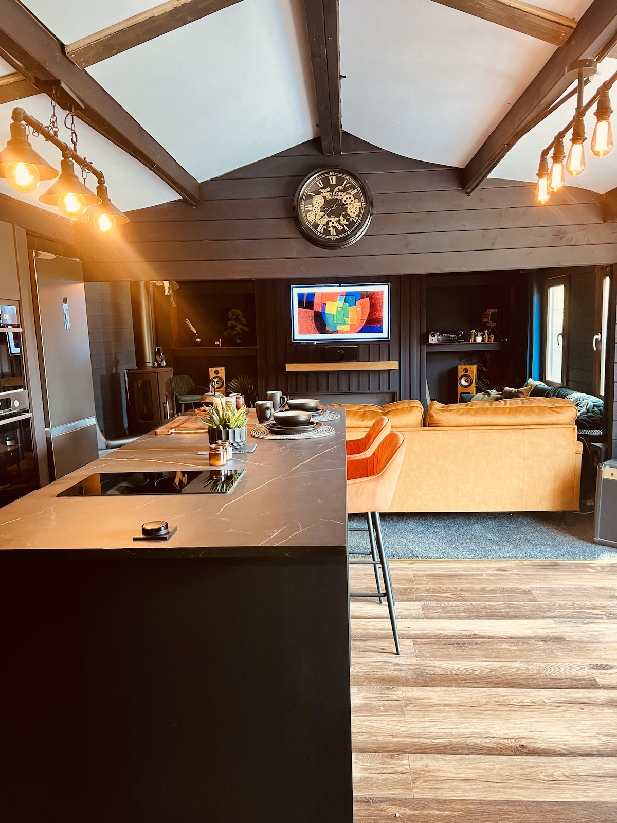 The lodge Is situated within the grounds of our home, and is completely self contained, with a full kitchen, separate bedroom, en suite shower and living area. The living area comfortably seats 4 and one of the sofas can be made into a small double bed if required. There is a fully functioning log burner and a large OLED TV with Dolby Atmos. The bedroom offers a superking sized bed, dressing table, and wardrobes. There is an en-suite shower room, with a luxury shower and heated mirror.