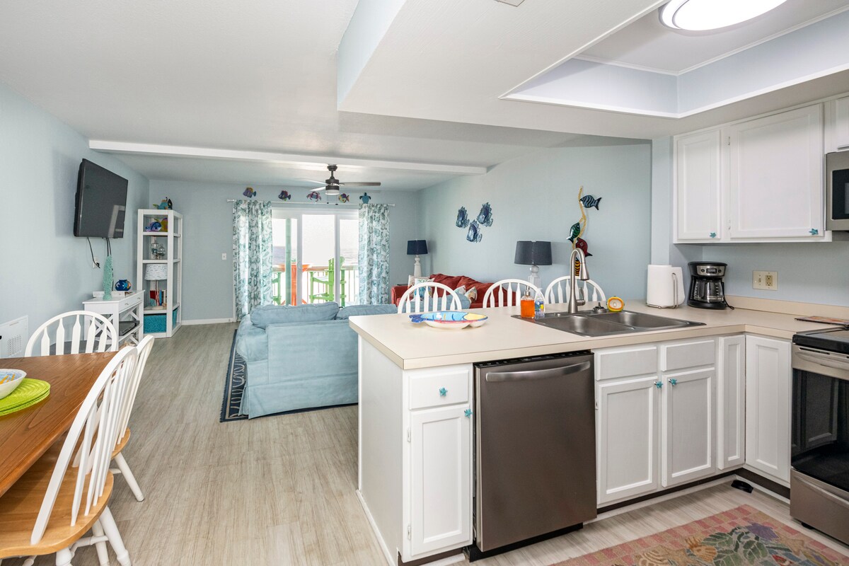 Studio just a 3min walk to the beach and the sound! Professionally decorated to welcome you to the Topsail lifestyle. Perfect for a couple or a getaway for just you. Open living area with a casual contemporary sofa, featuring a full kitchen with high-end appliances. Bistro dining area to enjoy the local fare. Queen bed comfort for sweet dreams! Beautiful bath with large walk-in shower and custom vanity. Bring as many clothes as you like, the closet is Fabulous. Smart TV with WIFI.